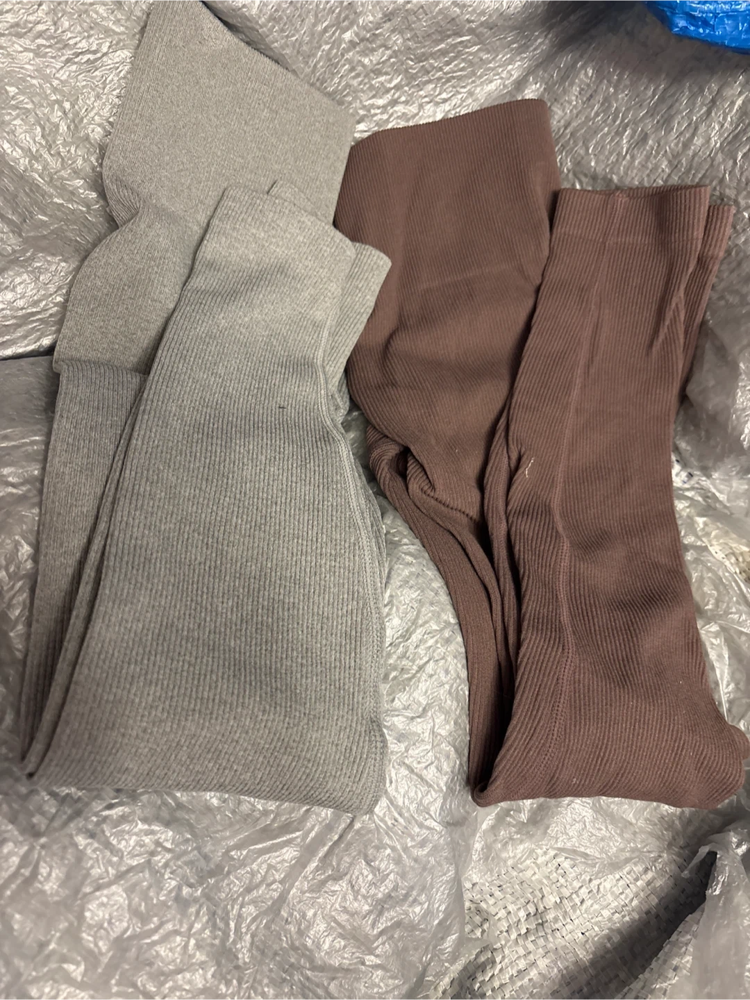 Two pairs of Lemon brand ribbed leggings. One pair is grey and the other is brown. Both are size XS/TP. Made with 66% nylon, 28% polyester, and 6% spandex.