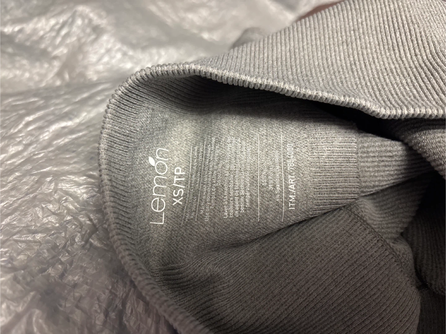 Two pairs of Lemon brand ribbed leggings. One pair is grey and the other is brown. Both are size XS/TP. Made with 66% nylon, 28% polyester, and 6% spandex.
