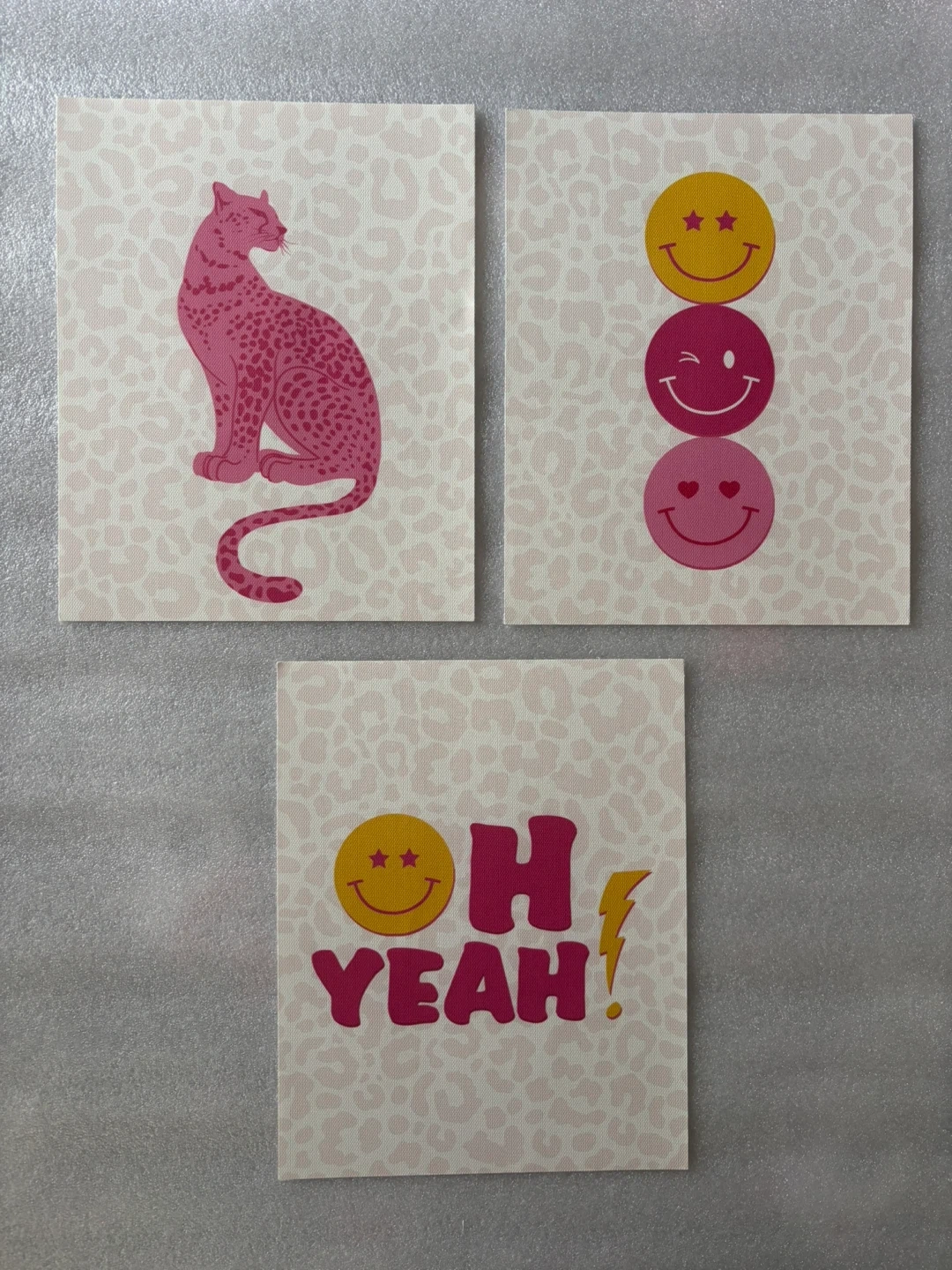 Here's a cute set of three canvas prints! They feature a pink leopard print, smiley faces, and the phrase 'Oh Yeah!' They'd be perfect for adding a pop of fun to any room