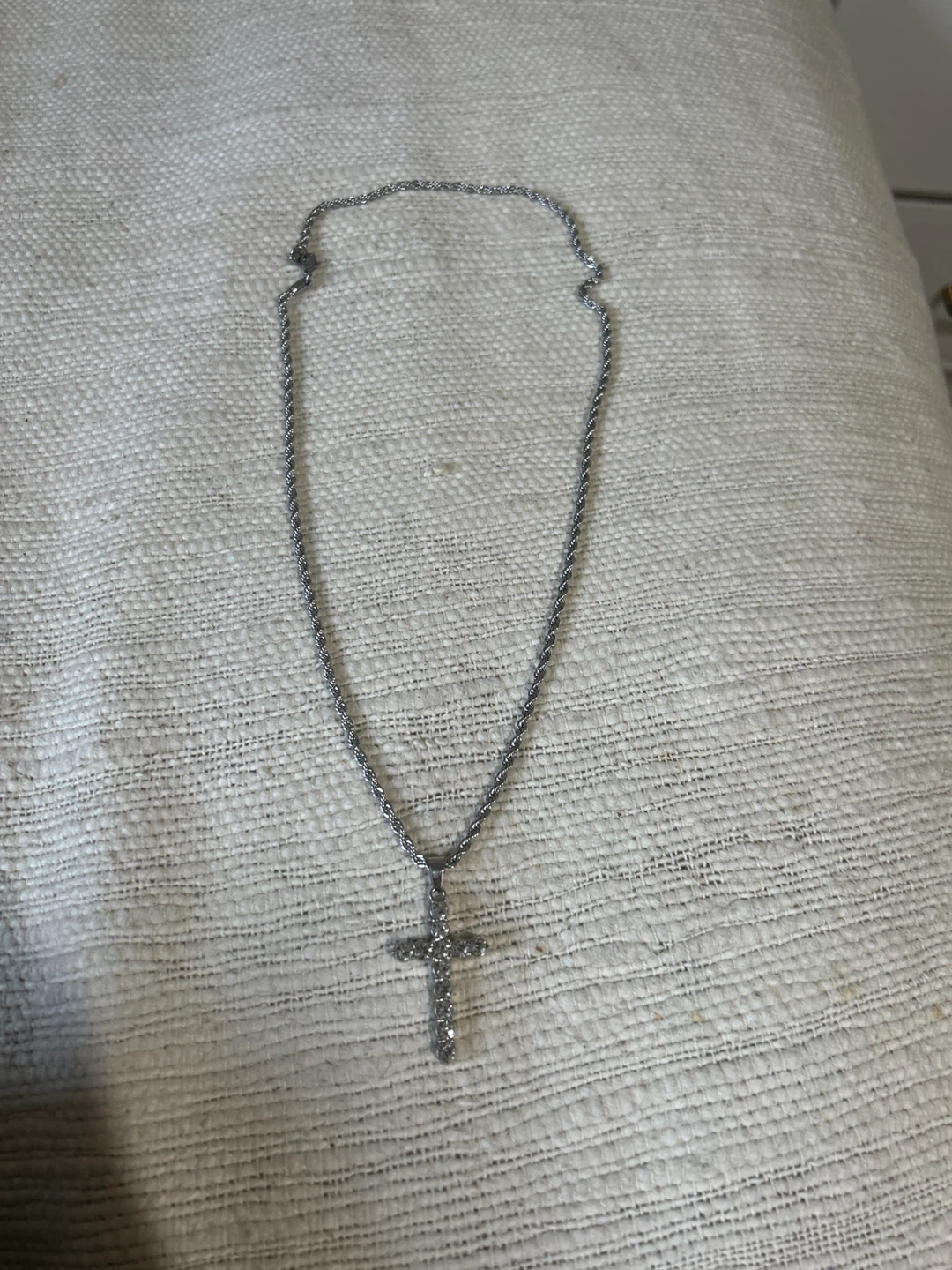 A stylish men's necklace featuring a cross pendant with sparkling stones. The rope chain is durable and measures 22 inches. It's a statement piece for everyday wear.