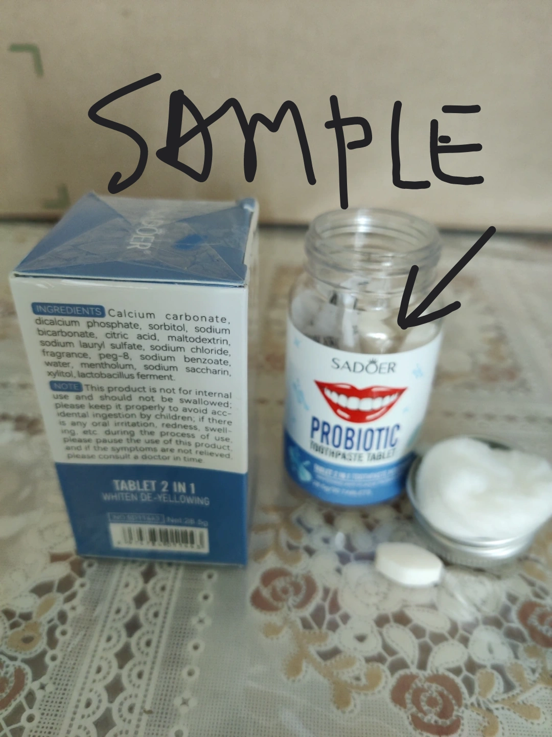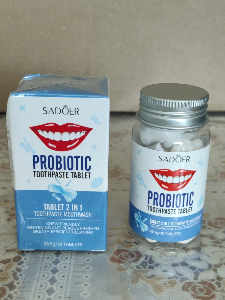 I'm selling Sadoer Probiotic Toothpaste tablets are designed for chewing, cleaning, whitening, and refreshing breath. They are compact and portable, making them easy to use anytime, anywhere! The box includes instructions for both gargling and brushing methods to keep your mouth feeling fresh and clean.