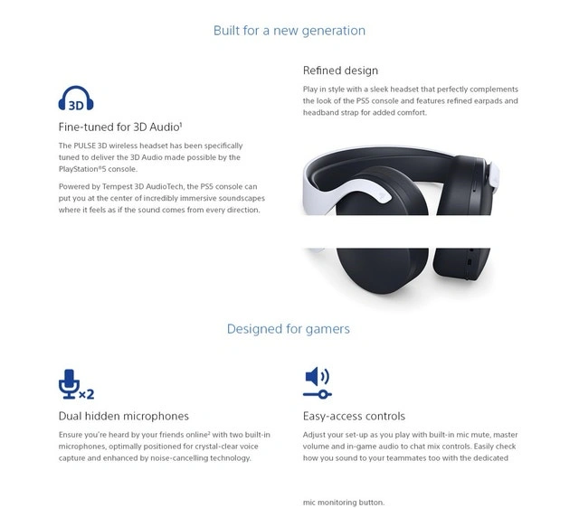 Specifically tuned to deliver the 3D Audio made possible by the PlayStation 5 console. Refined design. Dual hidden microphones. Easy-access controls. 3.5mm jack. Built for a new generation.