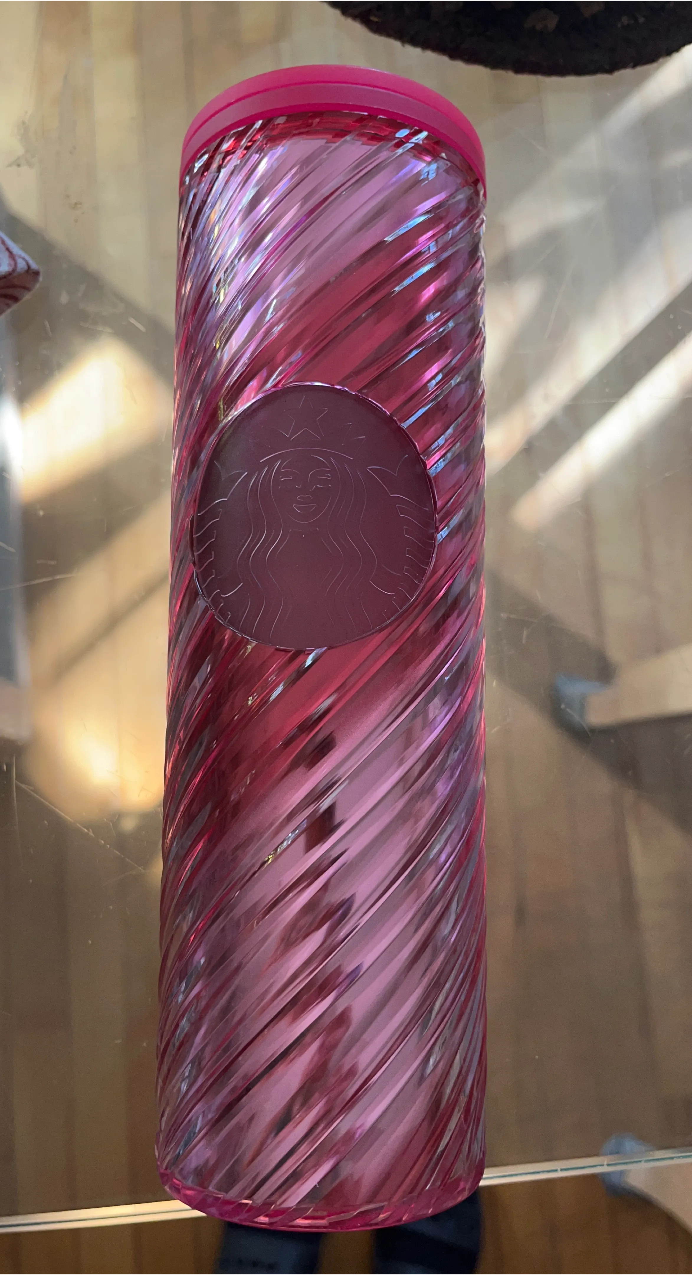 This is a pink Starbucks tumbler with a swirl design. It's great for holding your favourite drinks. The logo is embossed on the side.