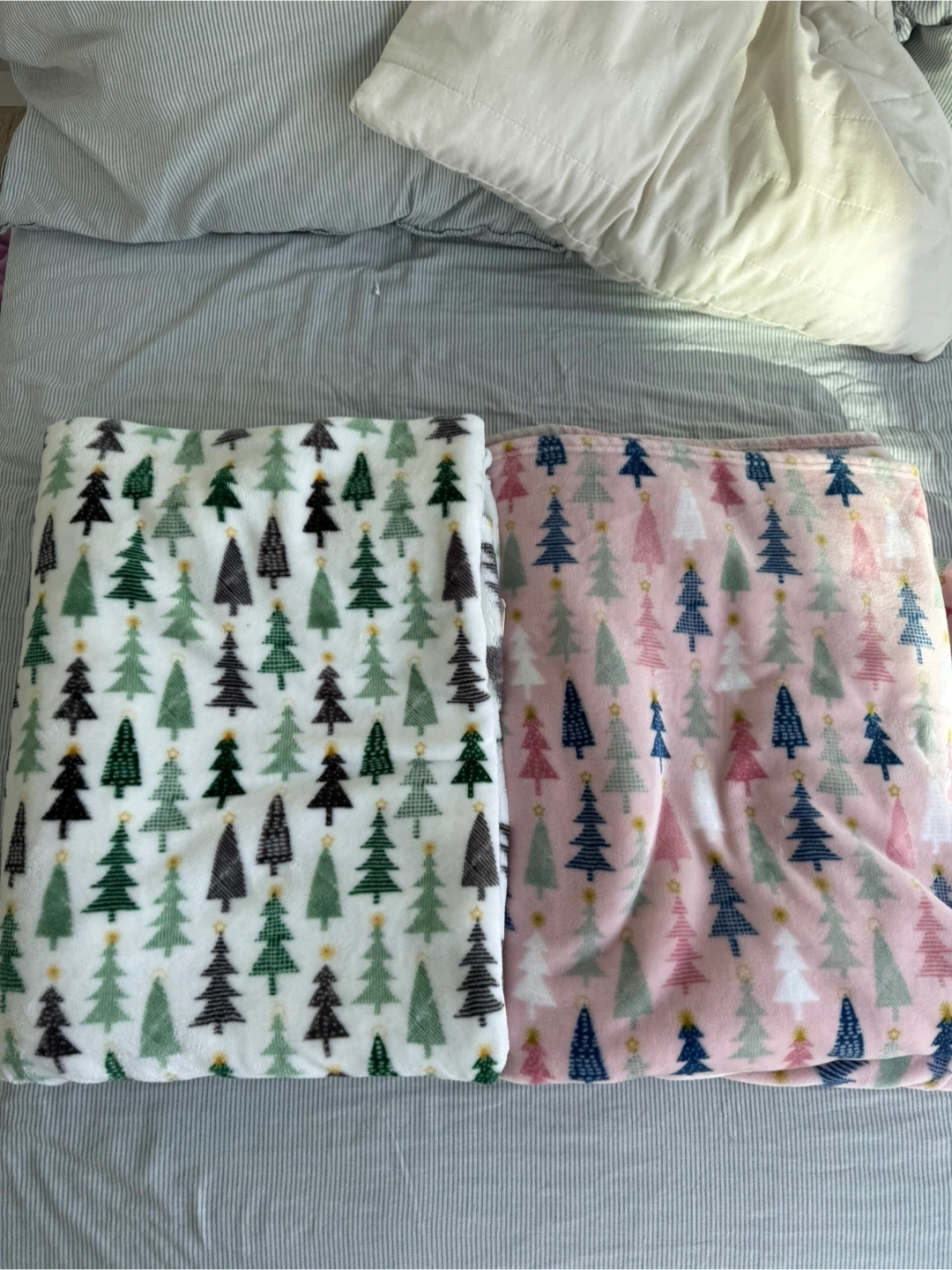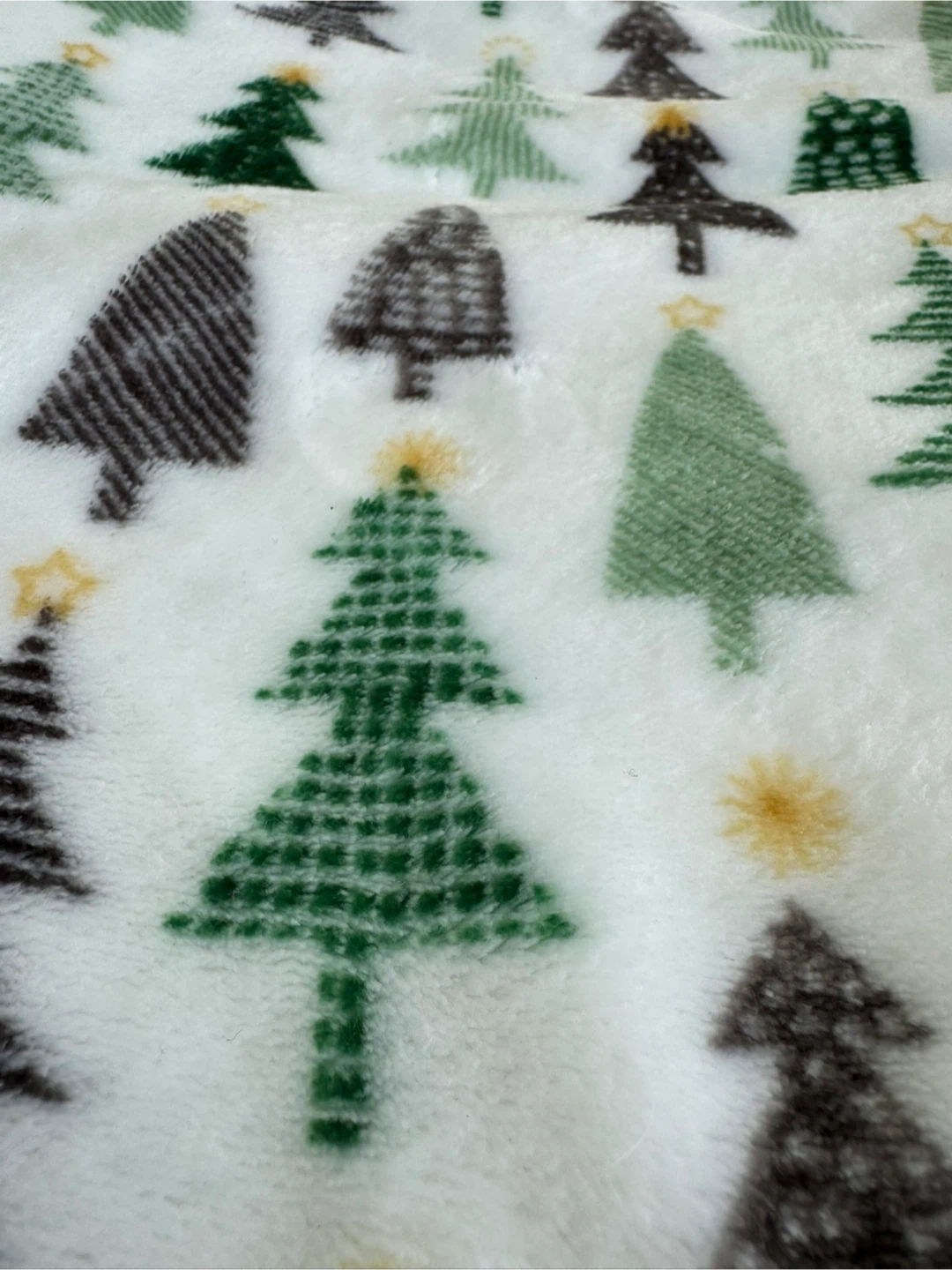 Pair of soft and cozy fleece throw blankets featuring a festive Christmas tree pattern.