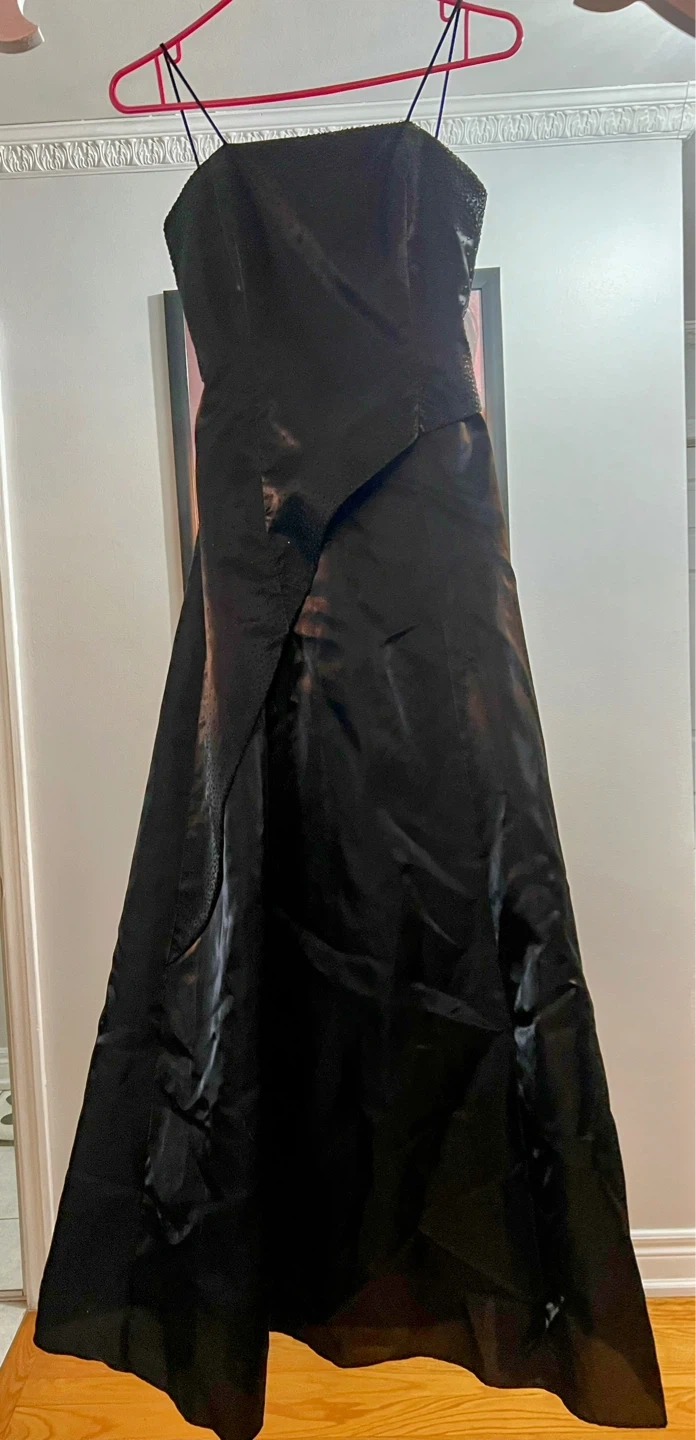 Black satin formal gown with spaghetti straps. This elegant dress has a sweetheart neckline and a flowing A-line skirt. It's perfect for galas or special occasions!