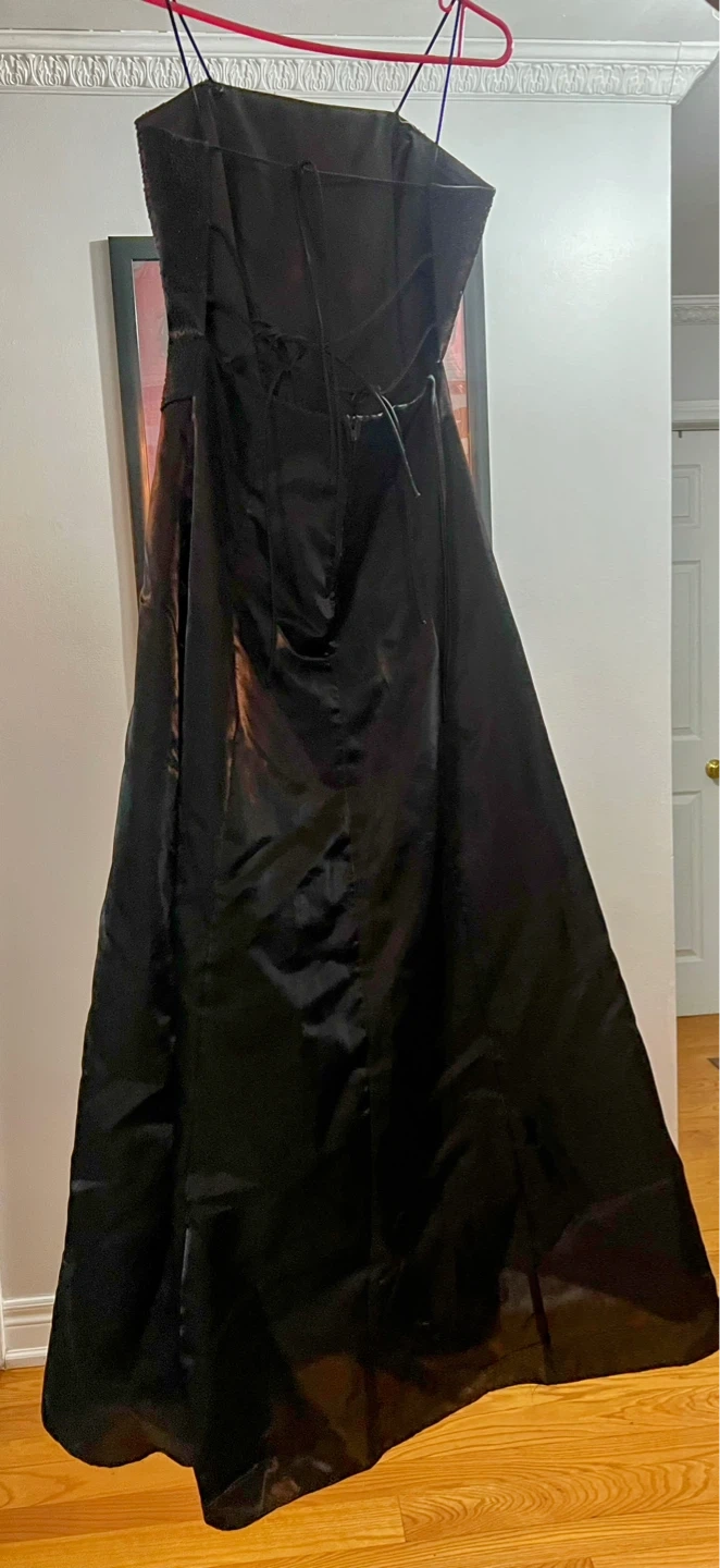Black satin formal gown with spaghetti straps. This elegant dress has a sweetheart neckline and a flowing A-line skirt. It's perfect for galas or special occasions!