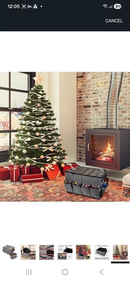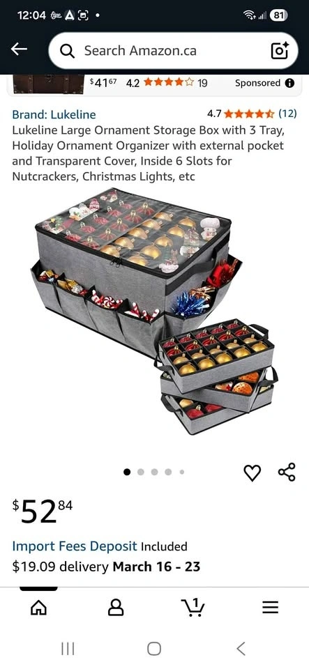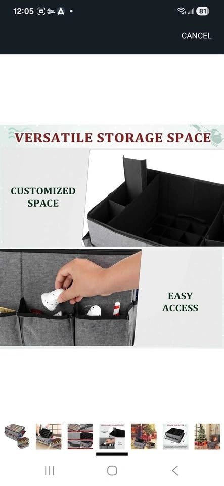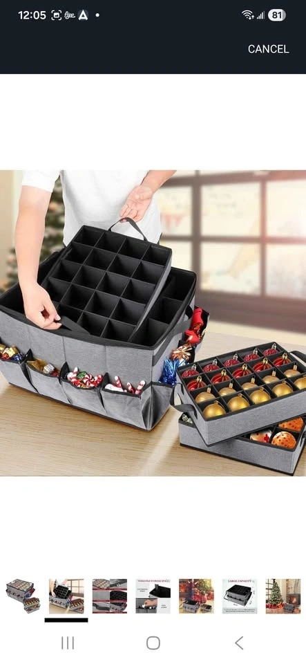 Lukeline Large Ornament Storage Box with 3 Trays. Features an external pocket and transparent cover. Inside has 6 slots, great for nutcrackers, Christmas lights, and more. Pet free and smoke free home.