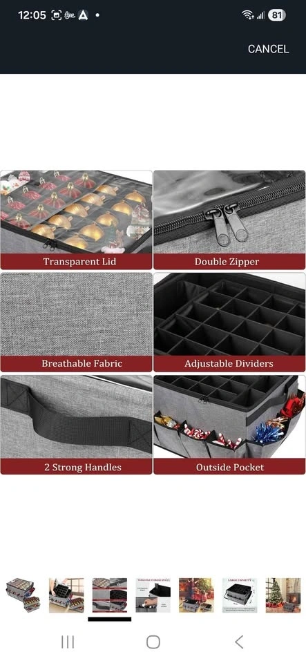 Lukeline Large Ornament Storage Box with 3 Trays. Features an external pocket and transparent cover. Inside has 6 slots, great for nutcrackers, Christmas lights, and more. Pet free and smoke free home.