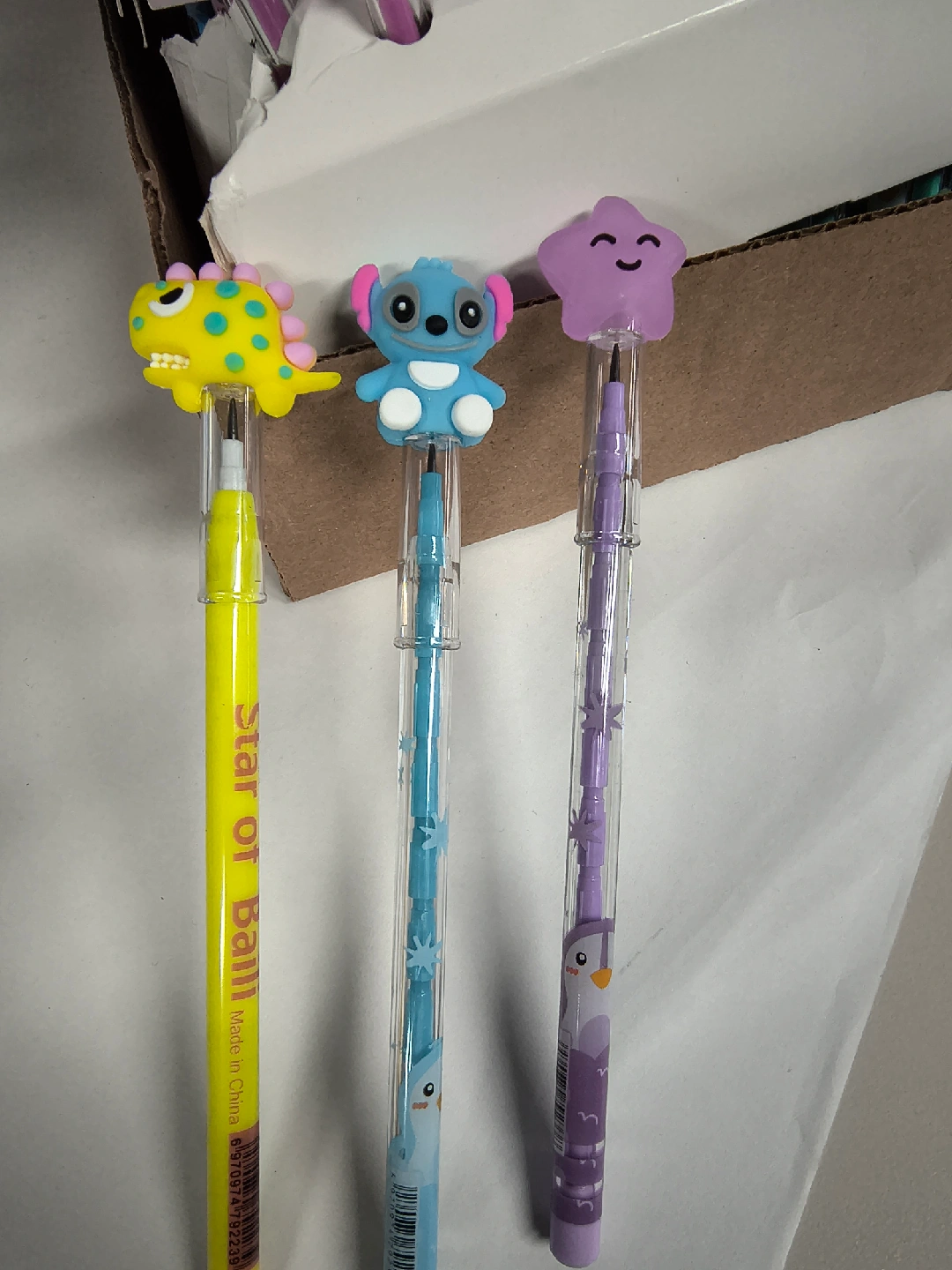 I have some adorable character stackable pencils! They are perfect for kids or anyone who loves cute stationery. The pencils feature various characters and come in different colours. They are in great condition and ready to use. Get yours today!