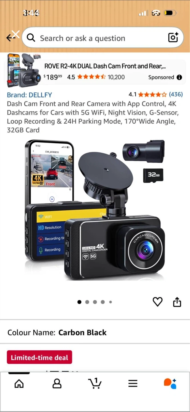 This is the DELLFY Rove R2-4K dual dash cam with front and rear cameras. It offers 4K resolution, 5G WiFi, and night vision. It has a 170-degree wide angle lens and includes a 32GB card. The camera also supports 24-hour parking monitoring.