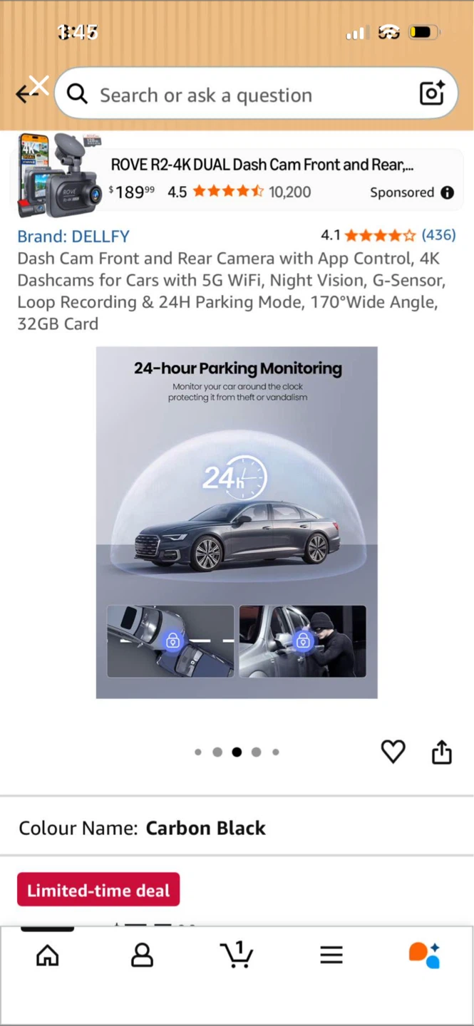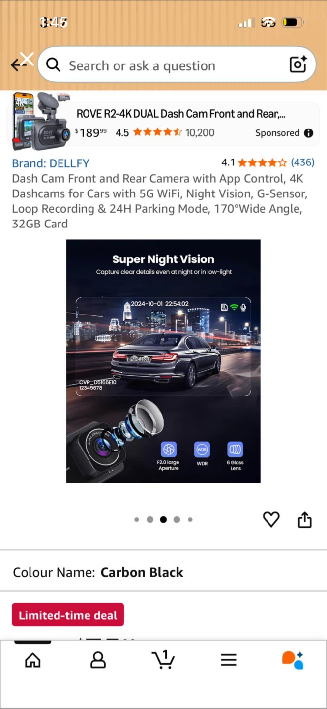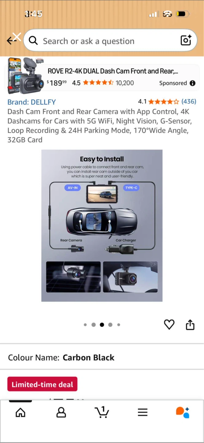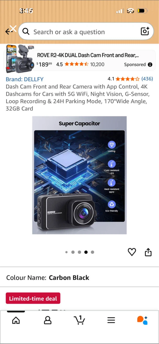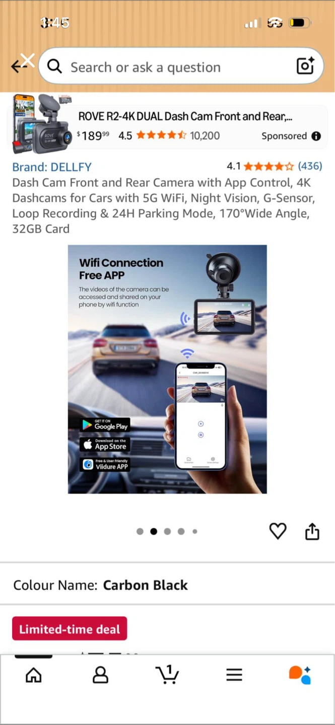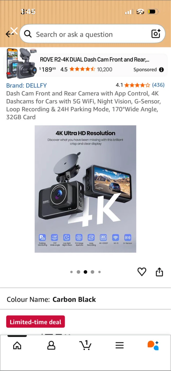This is the DELLFY Rove R2-4K dual dash cam with front and rear cameras. It offers 4K resolution, 5G WiFi, and night vision. It has a 170-degree wide angle lens and includes a 32GB card. The camera also supports 24-hour parking monitoring.