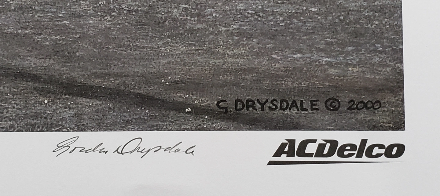 Signed limited edition print numbered 451/800. Features vintage cars at a used car dealership. Printed in Canada in 2003. ACDelco logo present.