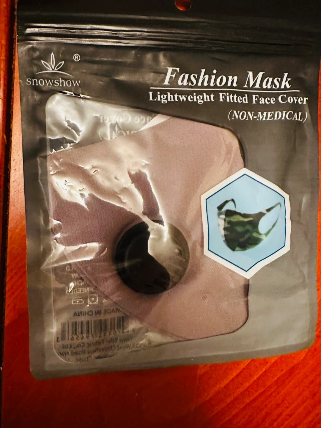 This is a Snowshow fashion mask. It's a lightweight, fitted face cover. Non-medical use.