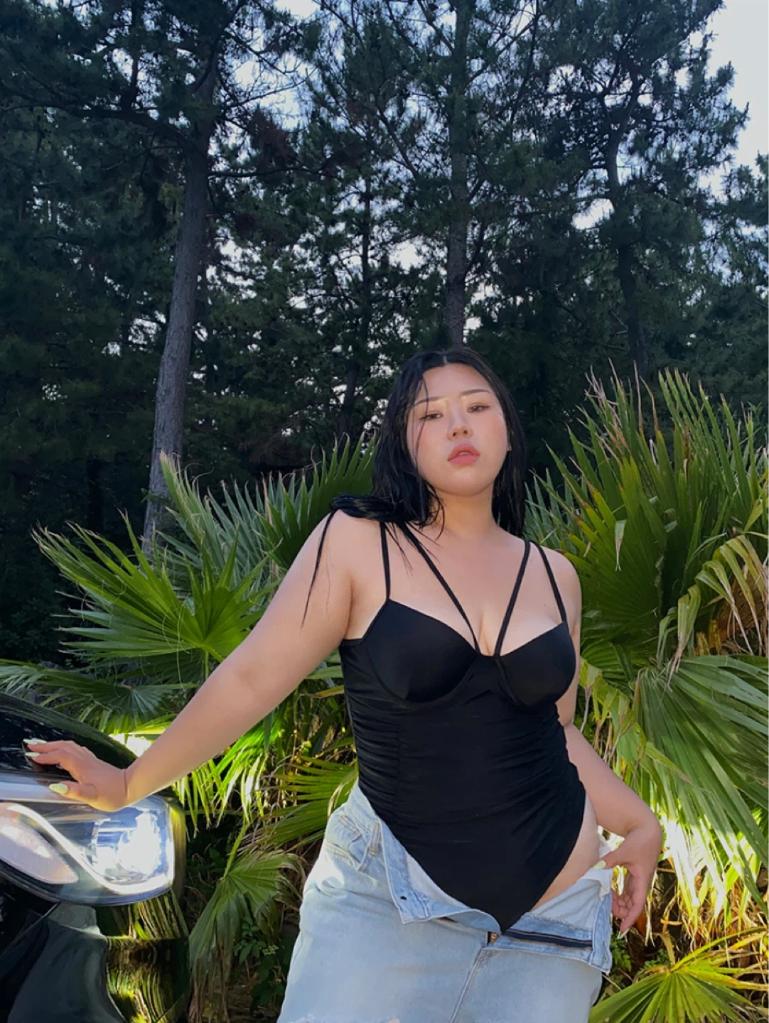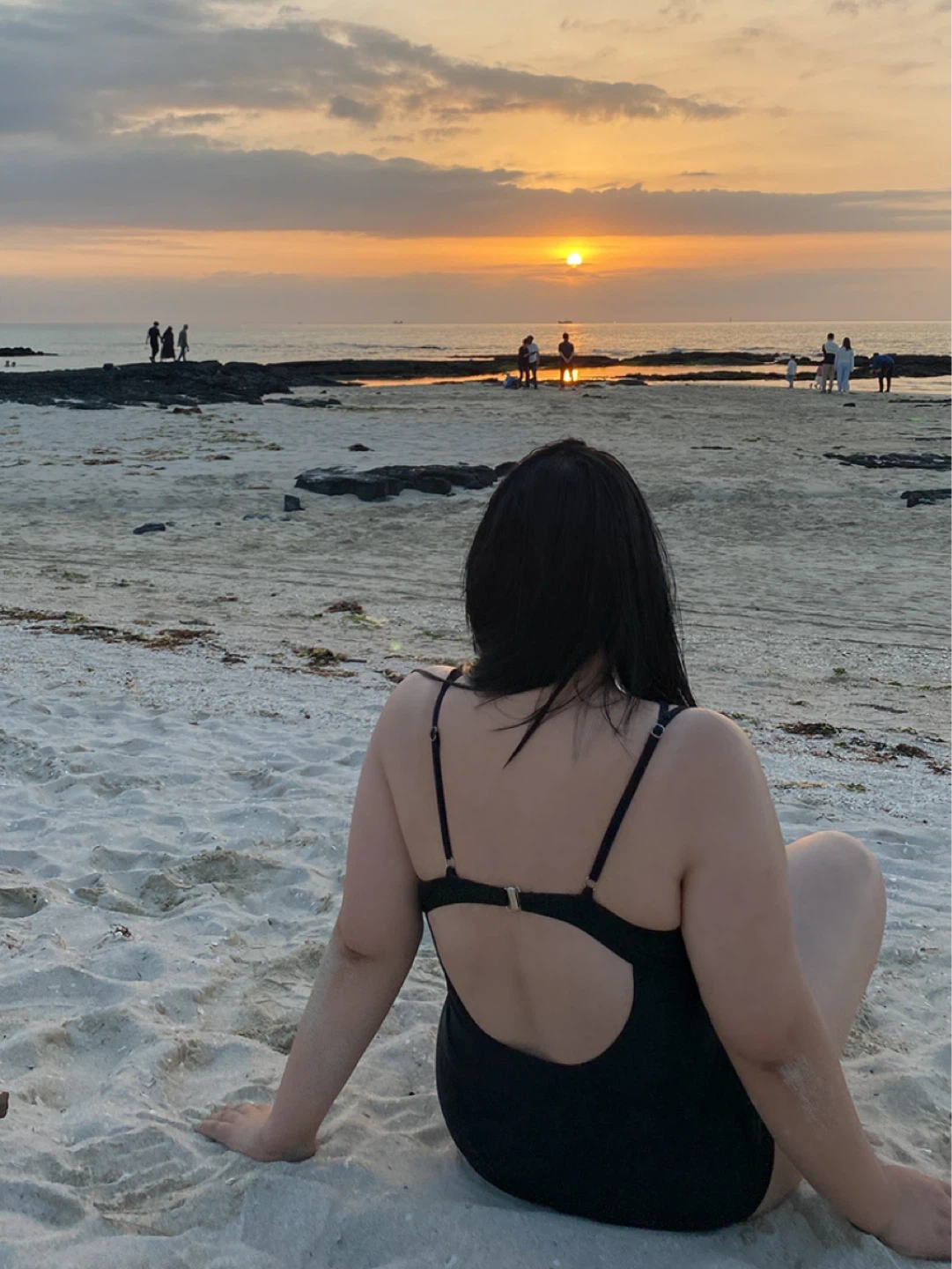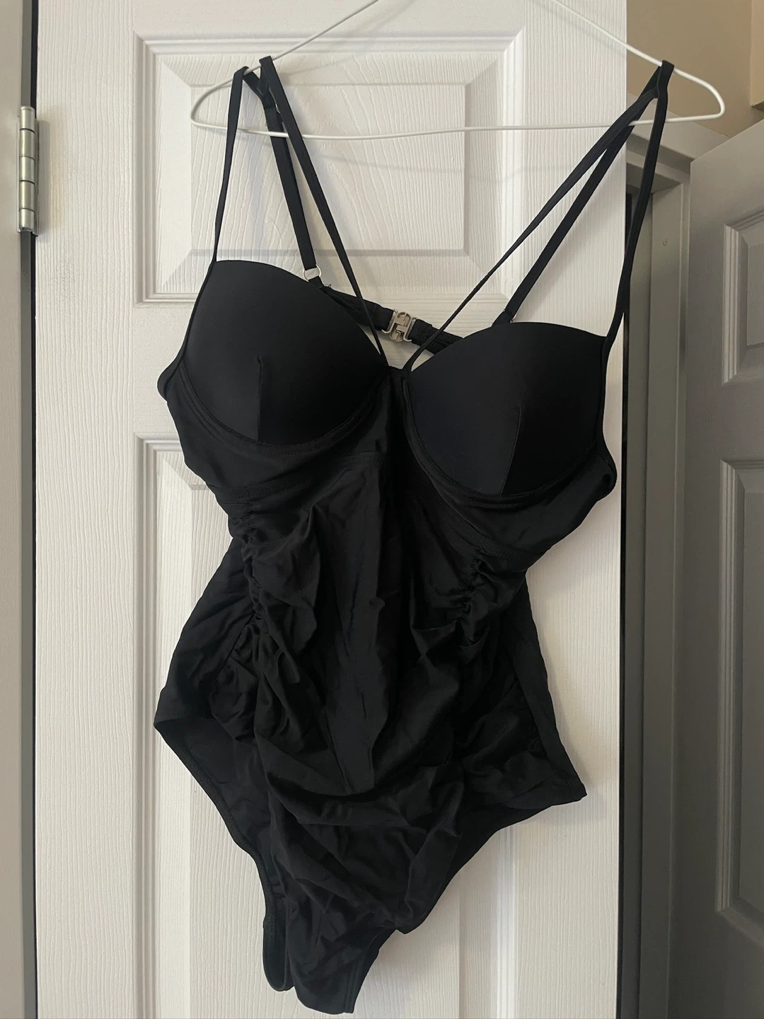 This black gorgeous one-piece swimsuit features a flattering ruched design can cover stomach and adjustable straps. It's perfect for your next beach vacation or pool day!