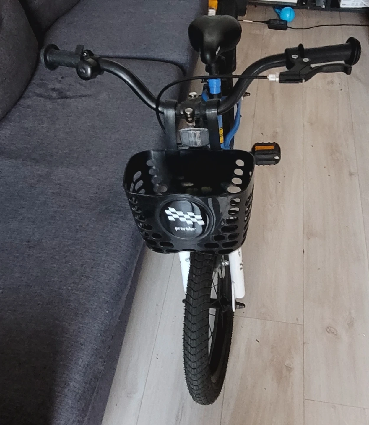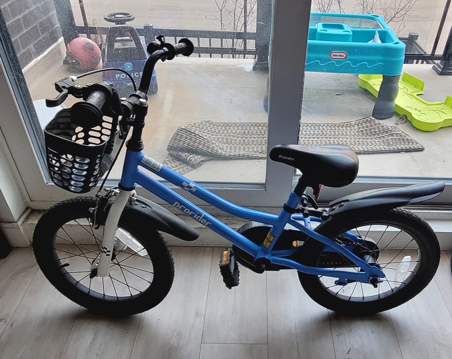 This is a blue ProRider kids bicycle, great for learning to ride. It has a sturdy frame and a front basket for carrying treasures. The handlebars and seat are height-adjustable to grow with your child. Perfect for outdoor adventures! Size 16 inches