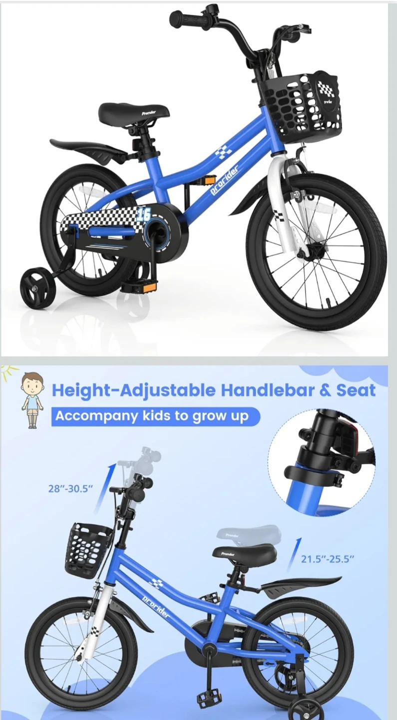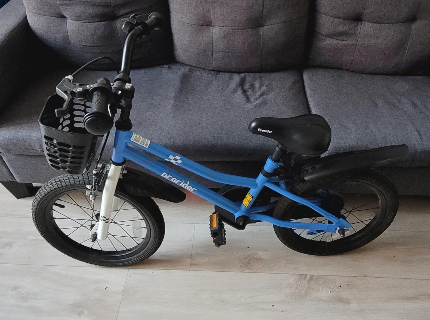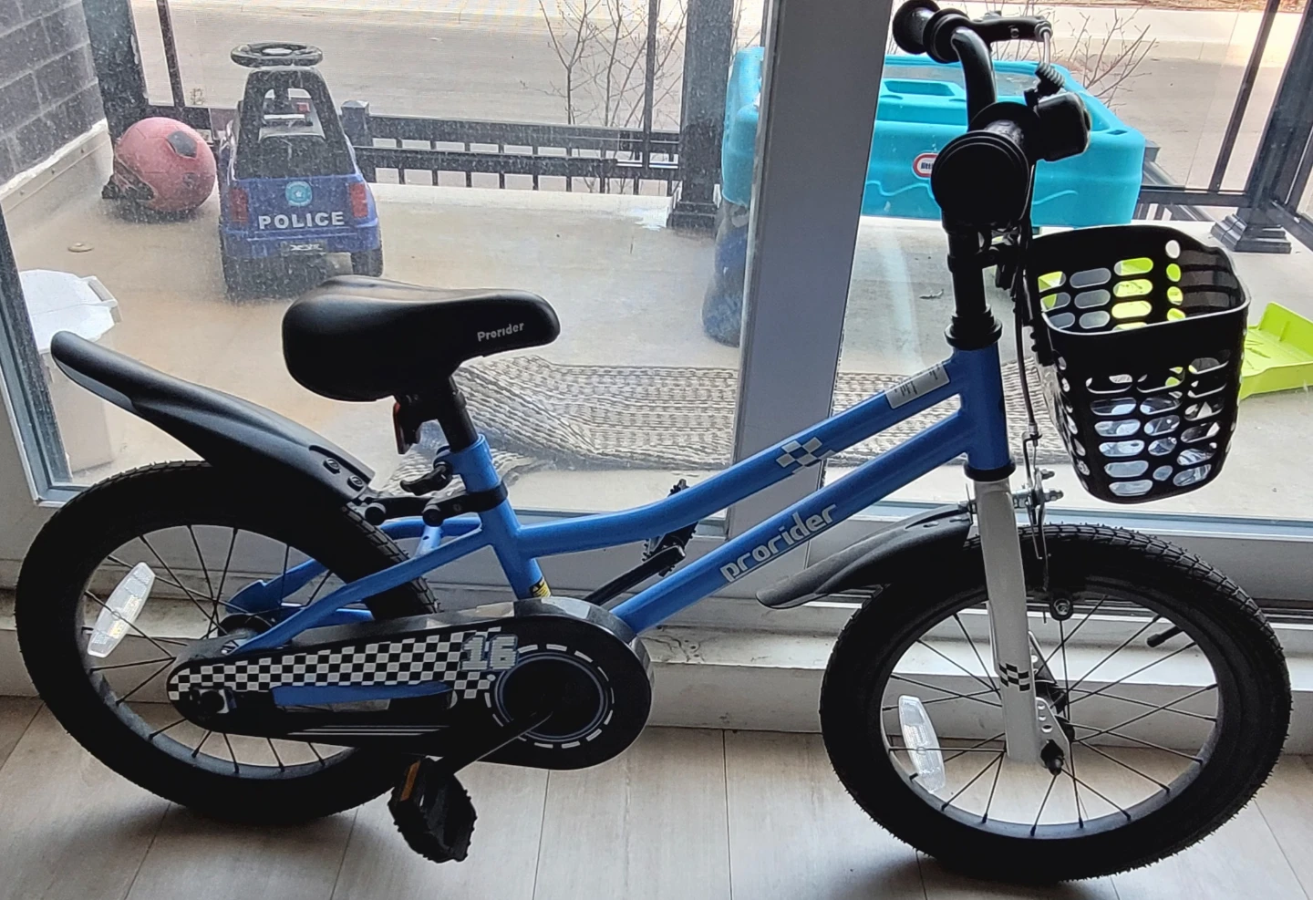 This is a blue ProRider kids bicycle, great for learning to ride. It has a sturdy frame and a front basket for carrying treasures. The handlebars and seat are height-adjustable to grow with your child. Perfect for outdoor adventures! Size 16 inches