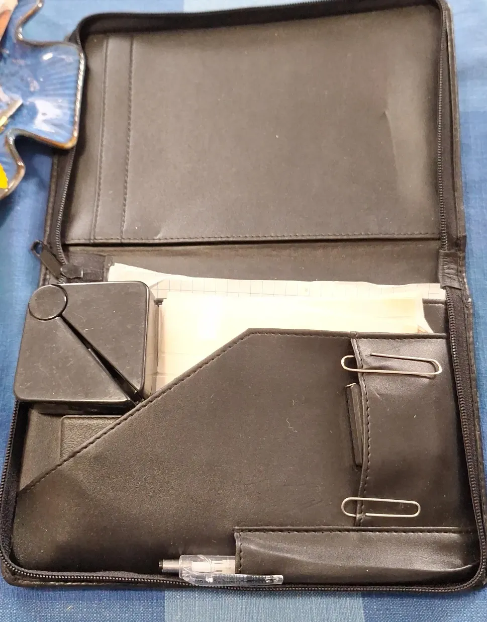 This black leather portfolio organizer zips closed and has multiple pockets for cards and documents. It includes a pen and a small notepad. Leather exterior.