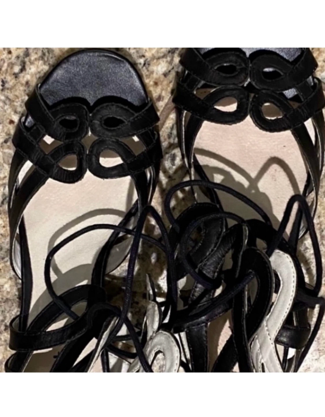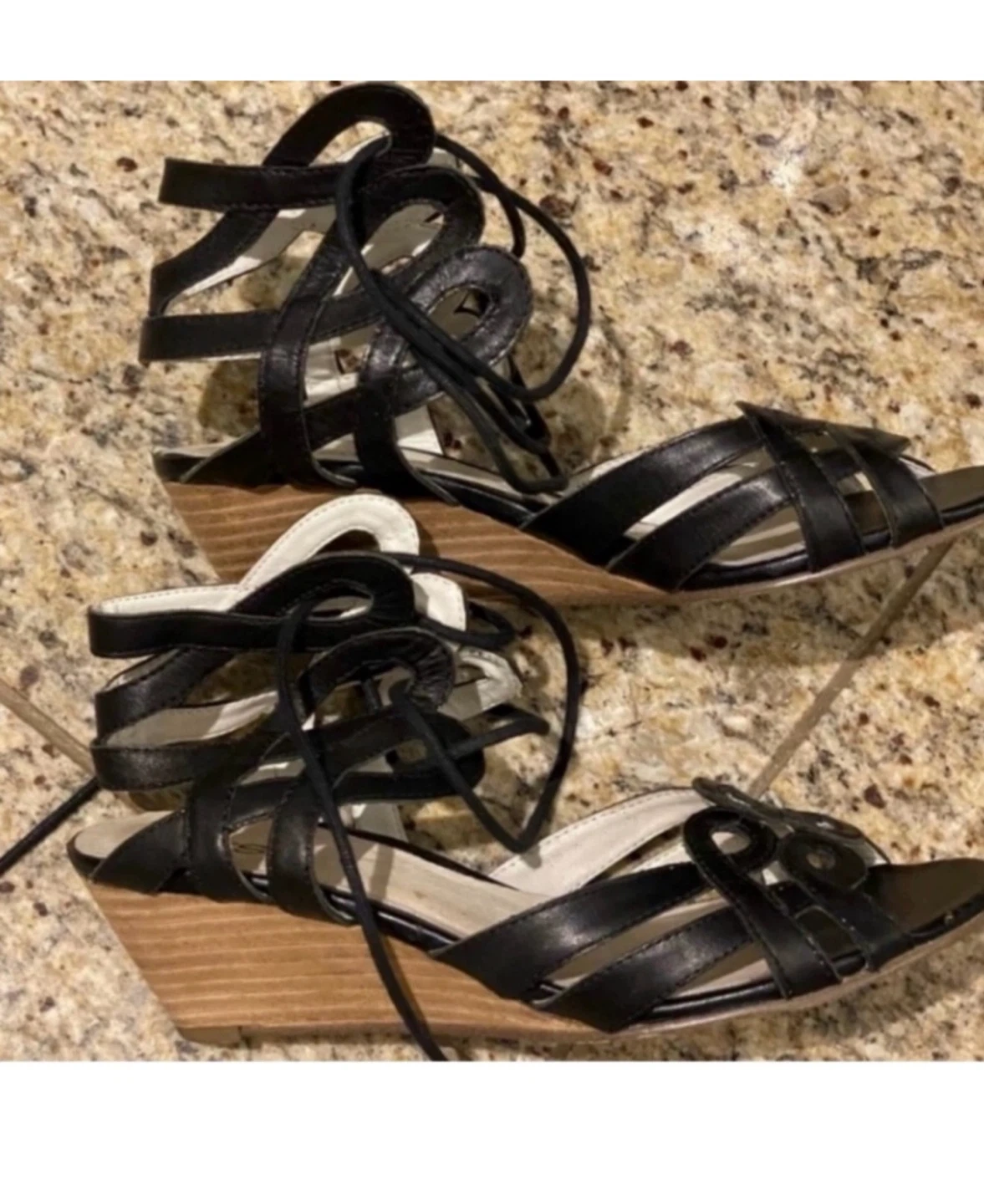 Stylish black wedge sandals with intricate lace-up detailing. Features leather upper material and a comfortable wooden-look wedge heel. Perfect for dressing up any outfit! Excellent like new condition.