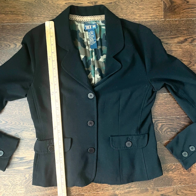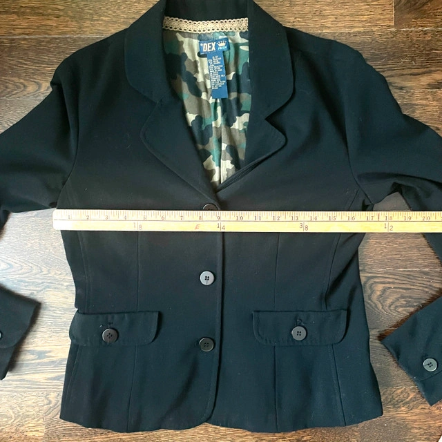 Selling a really Cute DEX Black Short Blazer Jacket-Size Small. Nice camouflage lining. Really nice fit. Gently used. 63% Polyester, 32% Rayon, 5% Spandex. Lining is cotton blend. Meausurements lying flat: Pit to pit: 17" Length: 21.5" Asking $30. Available for pick up in the Broadview/Danforth area. Contact-free porch pick up. Check out my other great stuff!