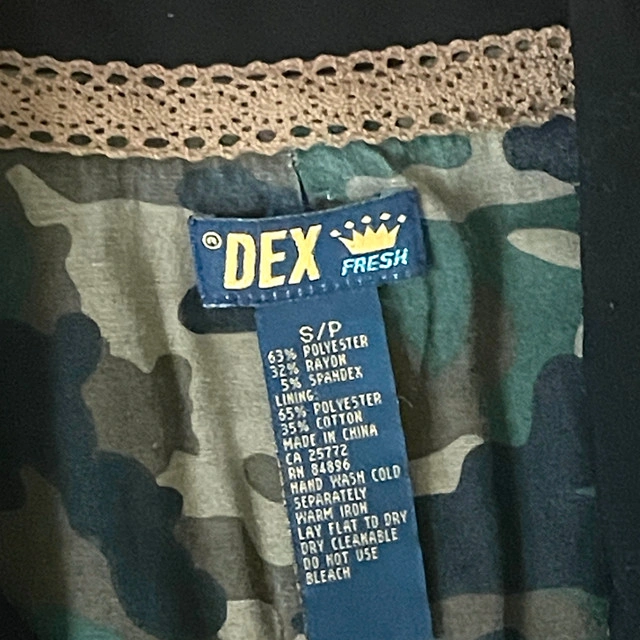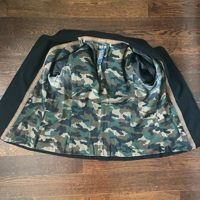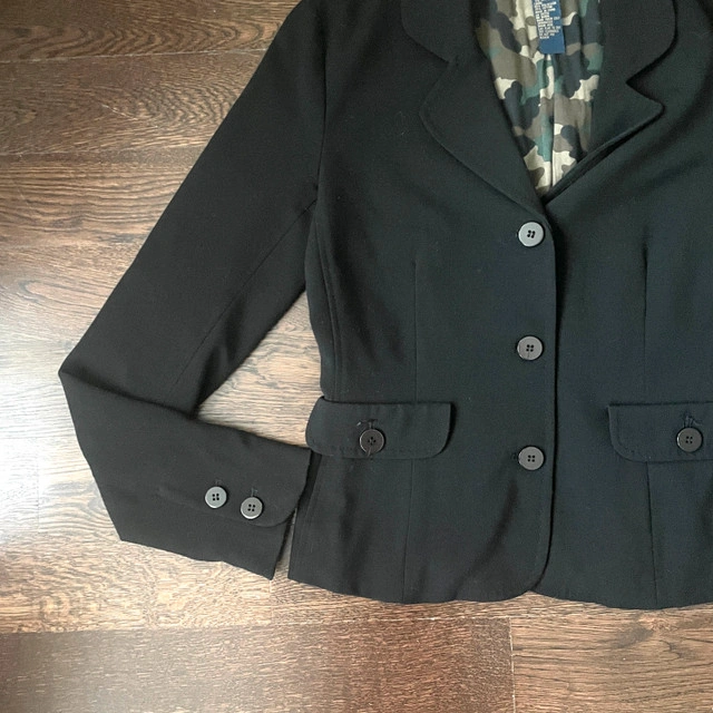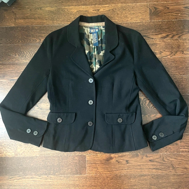 Selling a really Cute DEX Black Short Blazer Jacket-Size Small. Nice camouflage lining. Really nice fit. Gently used. 63% Polyester, 32% Rayon, 5% Spandex. Lining is cotton blend. Meausurements lying flat: Pit to pit: 17" Length: 21.5" Asking $30. Available for pick up in the Broadview/Danforth area. Contact-free porch pick up. Check out my other great stuff!