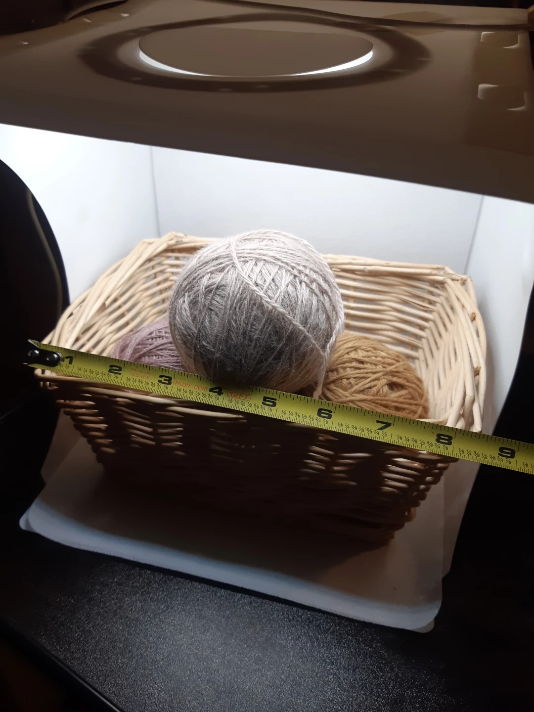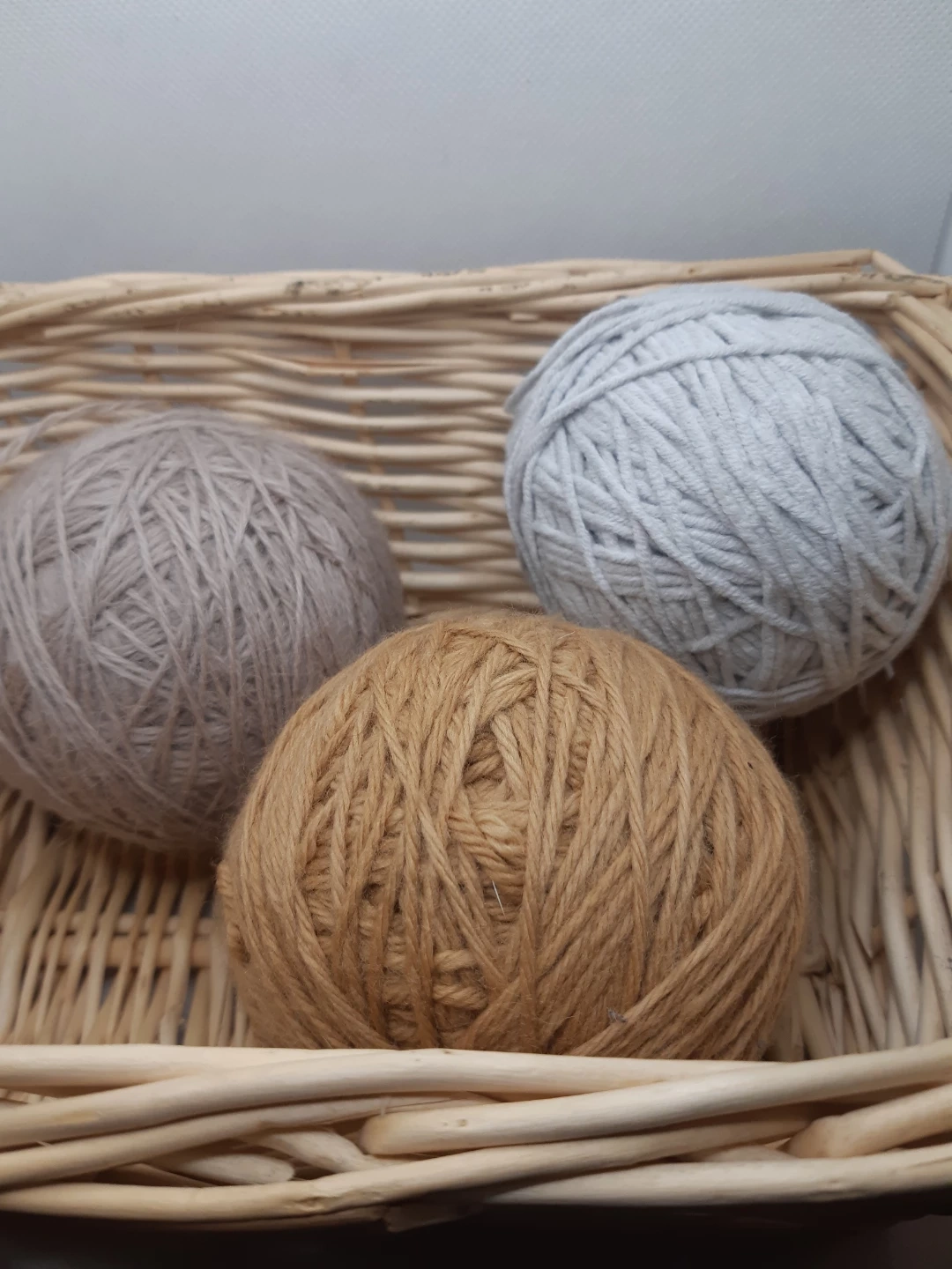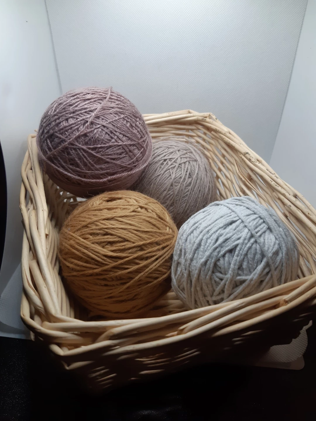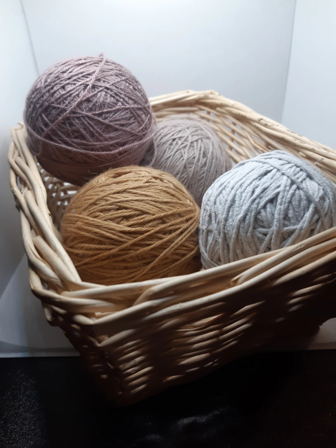 4 balls of yarn and the basket that holds them.