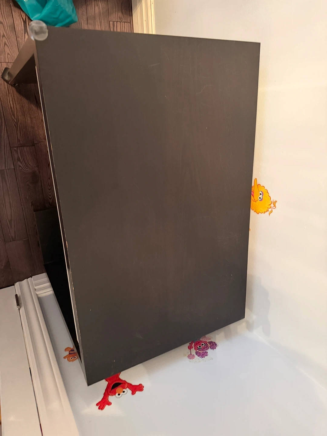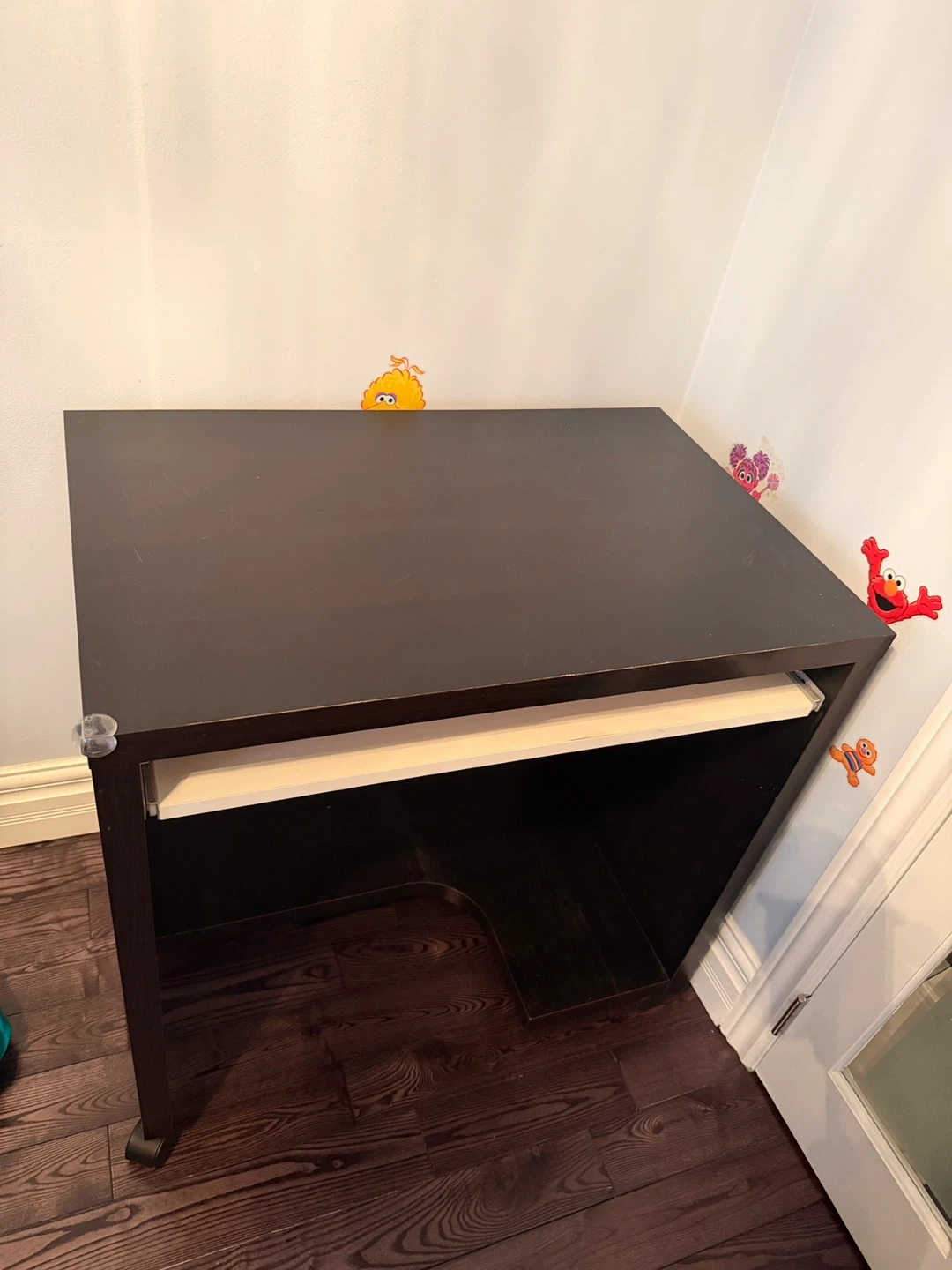 Dark brown kids computer desk. It has a pull-out keyboard tray. This desk is perfect for a home office setup.