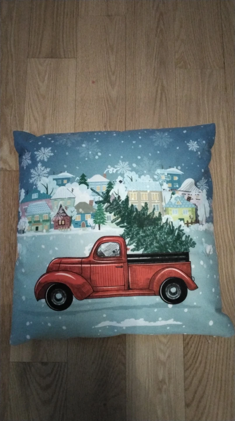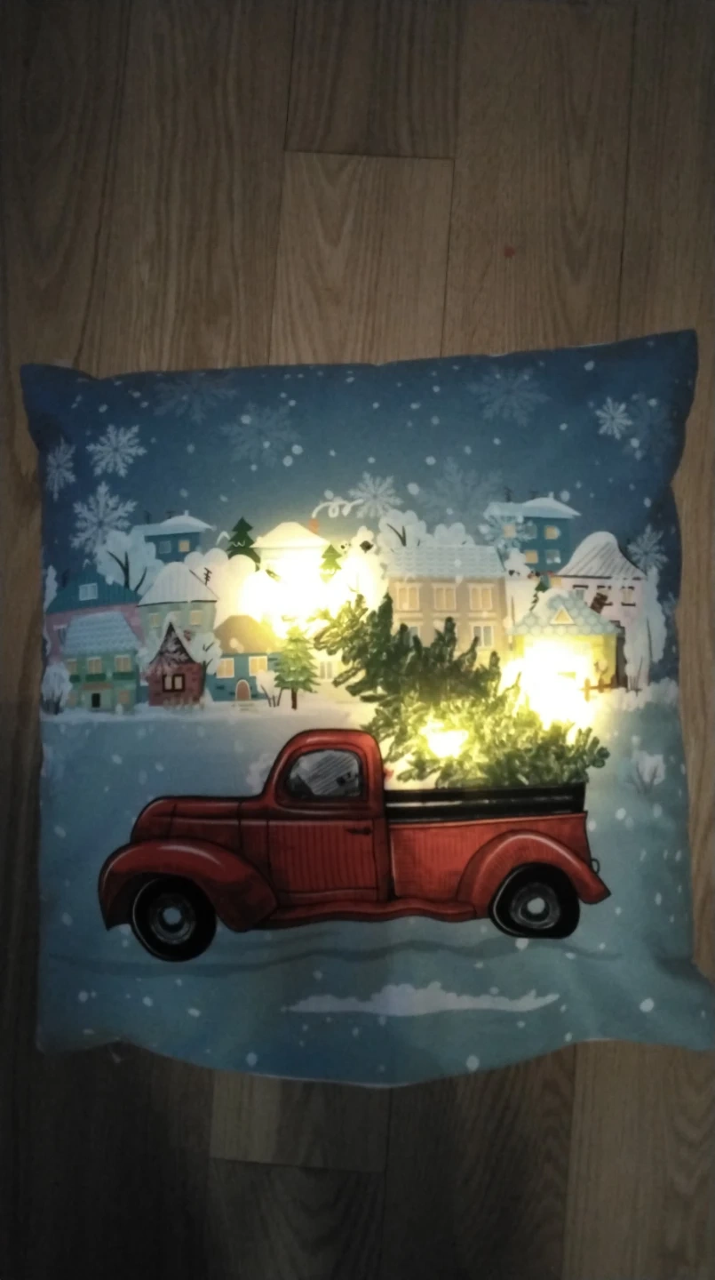 Cute Christmas pillow with a red truck and snowy village design! It has lights inside to make it extra festive for the holidays