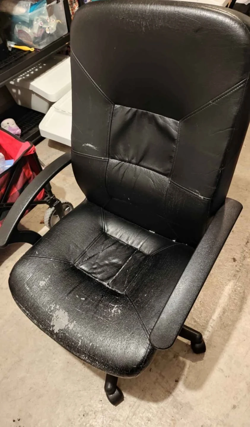 This is a black faux leather office chair. It shows signs of wear with some peeling on the seat and armrests. Chair is functional and has wheels for mobility.