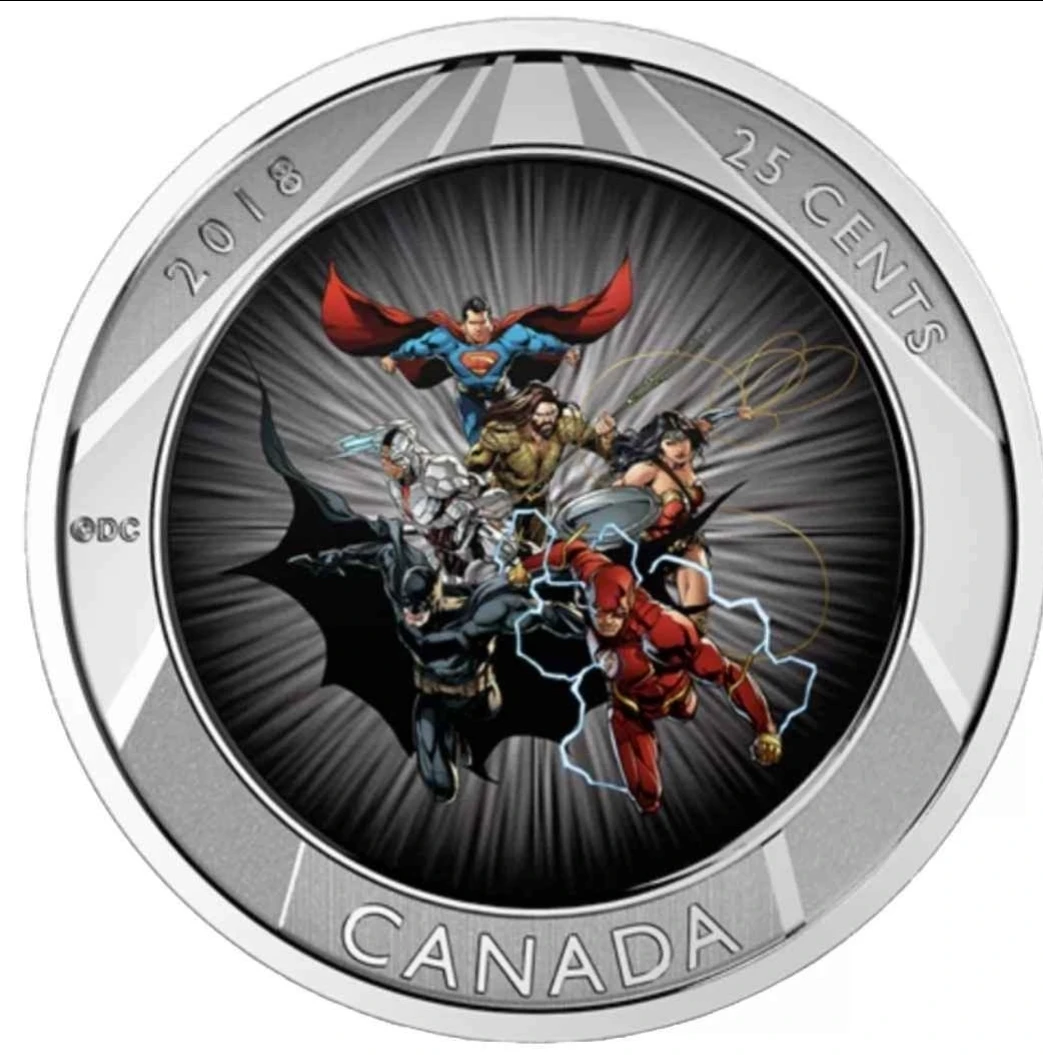 Selling a 2018 Canada 25 cent coin featuring the Justice League! It comes with one lenticular coin and two trading cards. A great collectible for any DC fan!