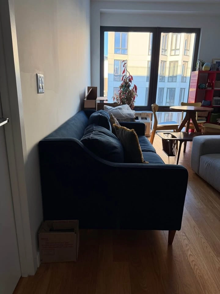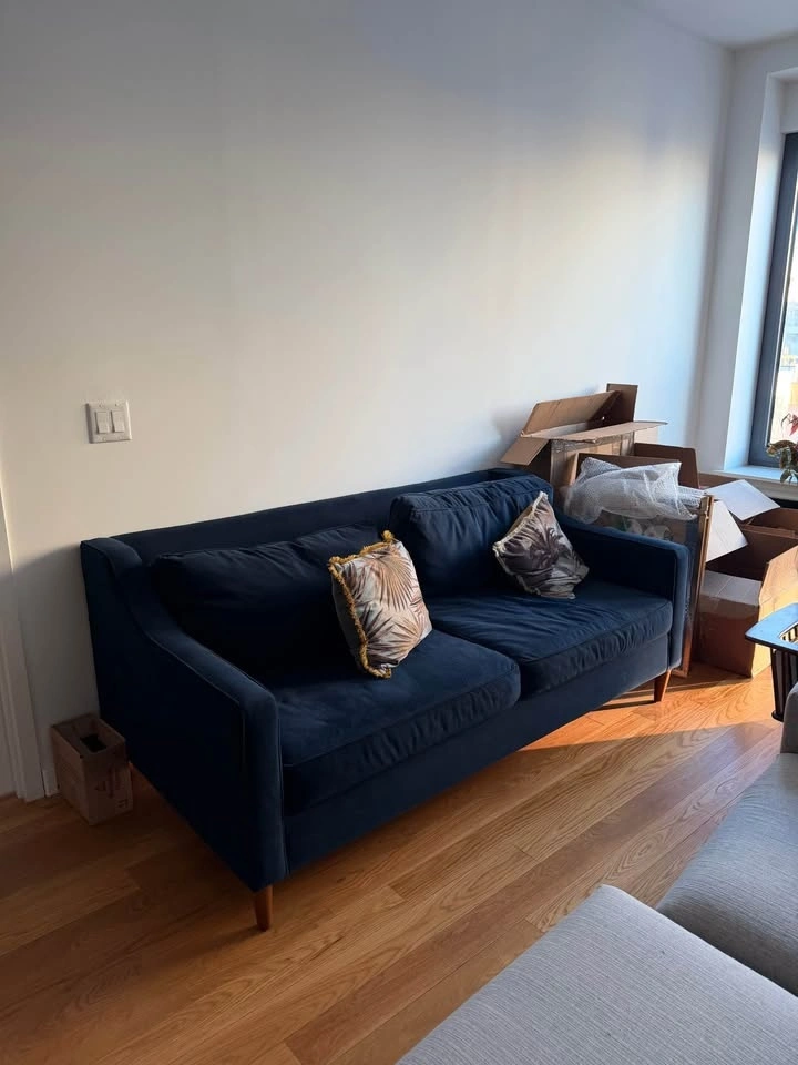 Beautiful navy blue velvet sofa from West Elm in a classic mid-century modern style. Super comfortable and sturdy, perfect for an apartment or living room setup. Features rich navy velvet upholstery, clean track arms, tapered wooden legs, and two removable seat cushions. Comfortably seats 2–3 people.