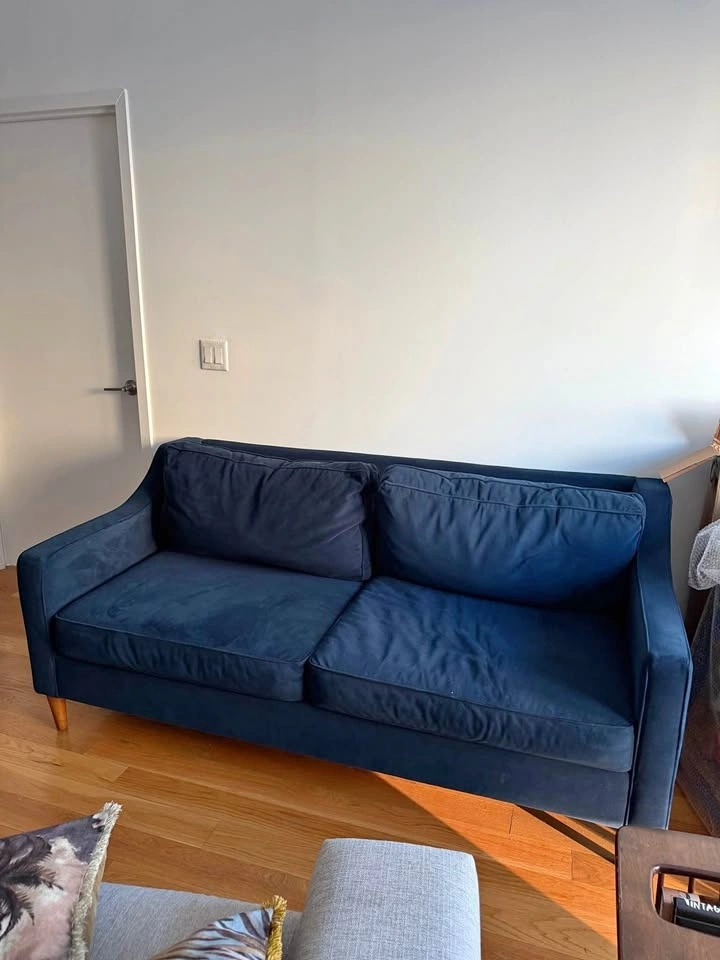 Beautiful navy blue velvet sofa from West Elm in a classic mid-century modern style. Super comfortable and sturdy, perfect for an apartment or living room setup. Features rich navy velvet upholstery, clean track arms, tapered wooden legs, and two removable seat cushions. Comfortably seats 2–3 people.