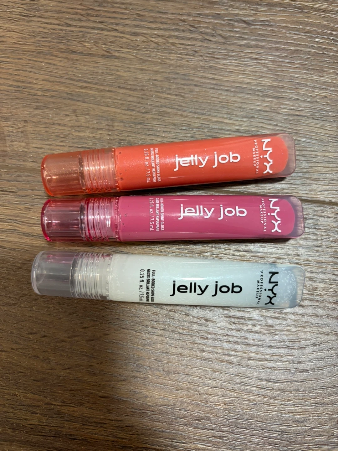 Three NYX Jelly Job full-bodied shine glosses included. Each gloss is 0.25 fl. oz. or 7.5 mL. These are great for adding a glossy finish to your lips!