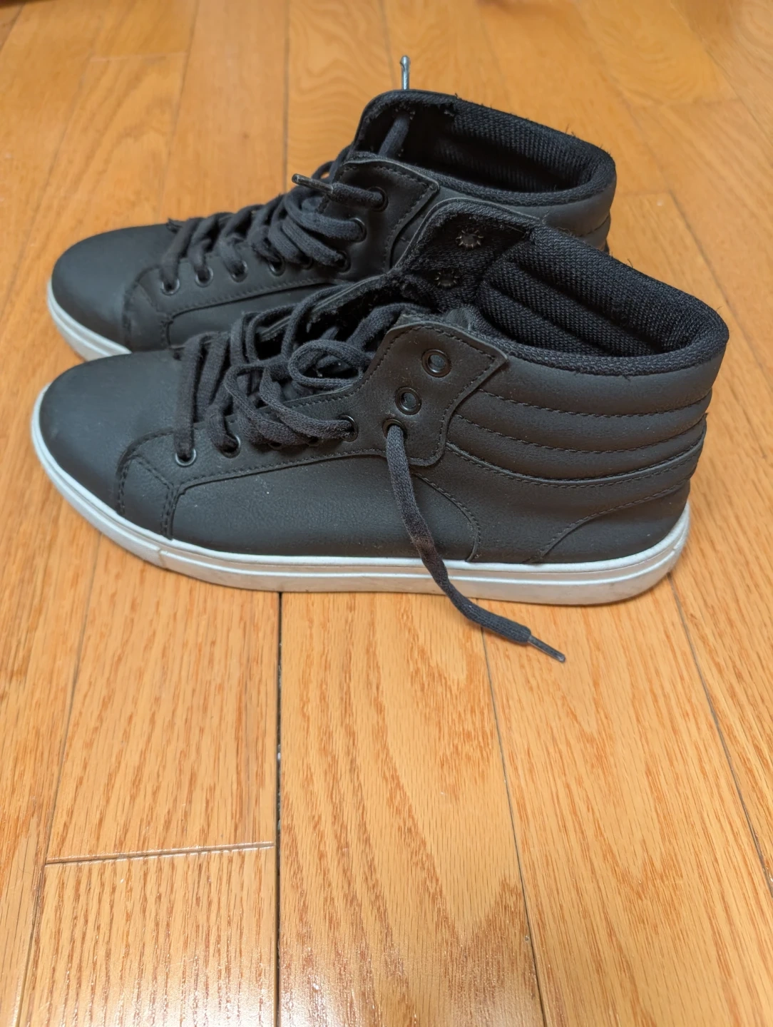 These black high-top sneakers are a versatile addition to any wardrobe. They feature a classic lace-up closure and durable construction. They're suitable for casual wear and everyday activities. Size 8-8.5