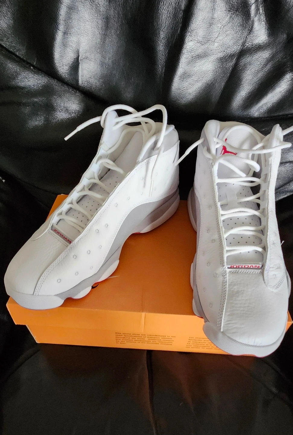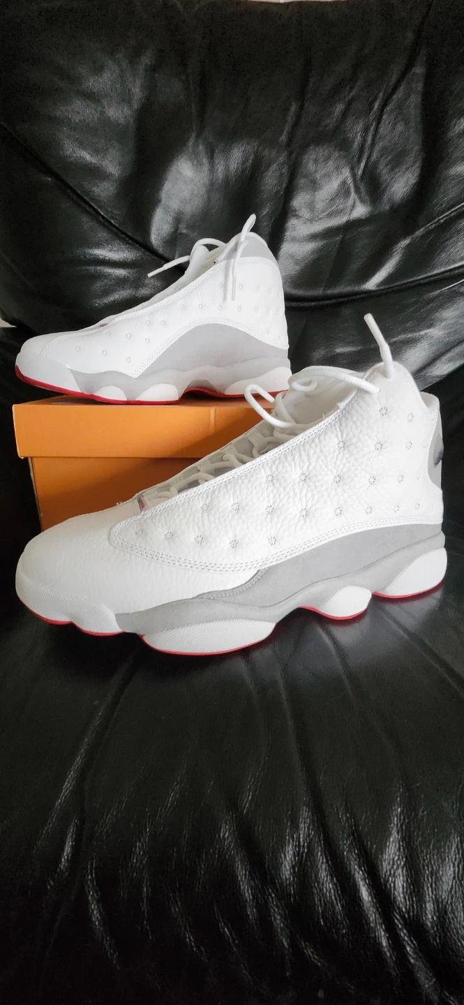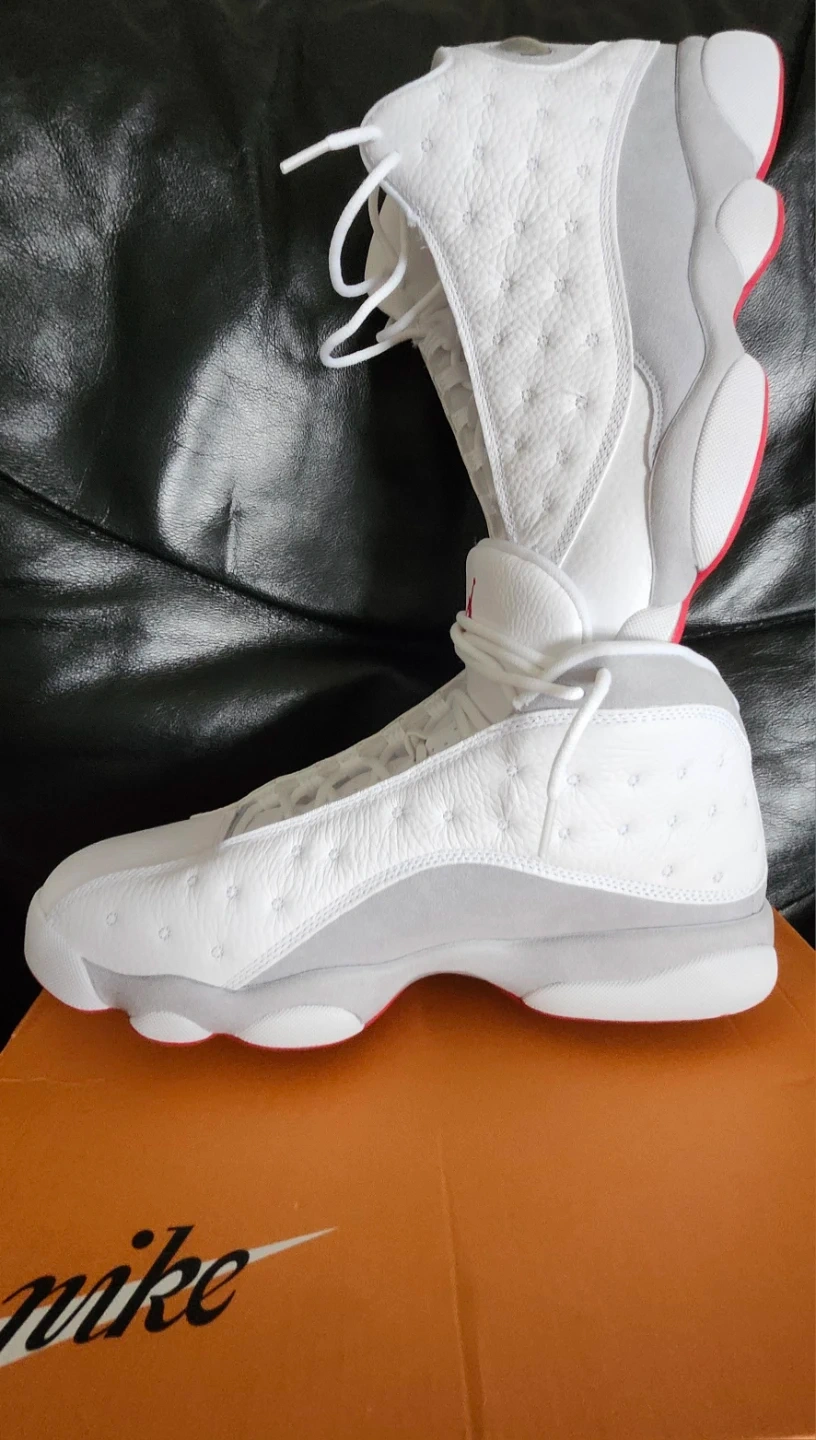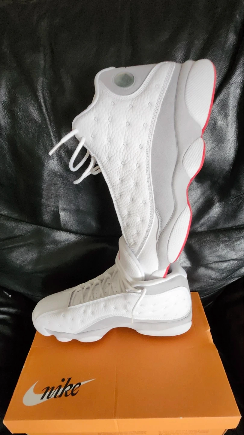 These Jordan 13 Retro sneakers are a clean white with grey and red accents. No box. Great for any sneaker collector!