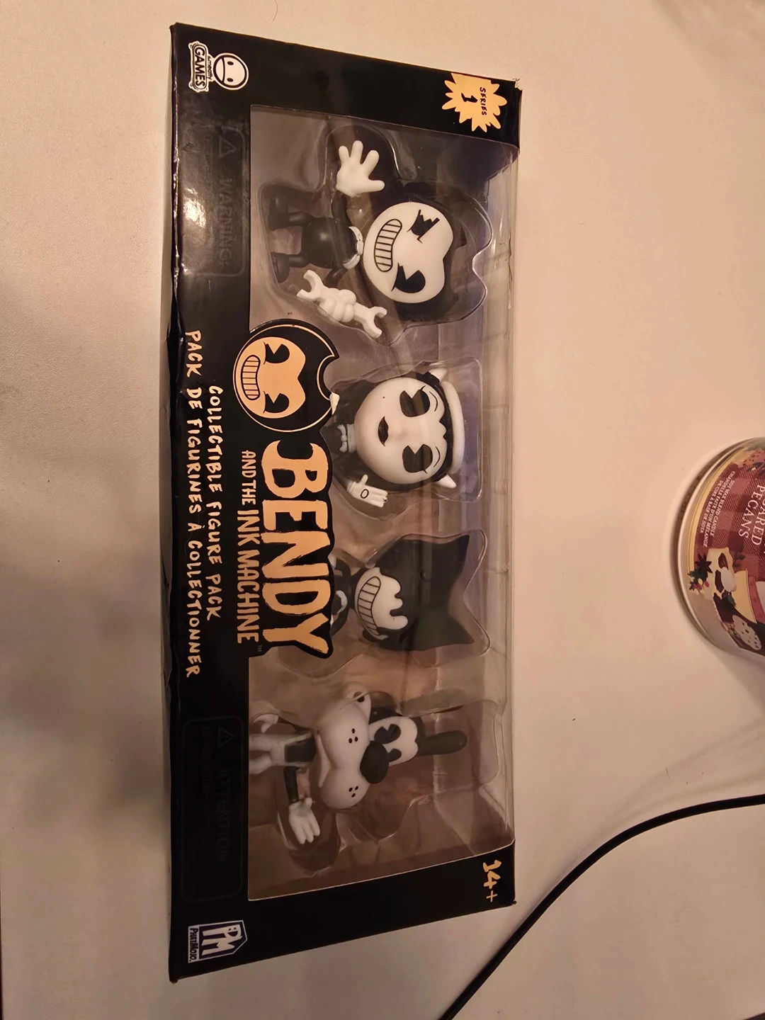 This is a Bendy and the Ink Machine collectible figure pack. It includes multiple figures from the game. Recommended for ages 14+.