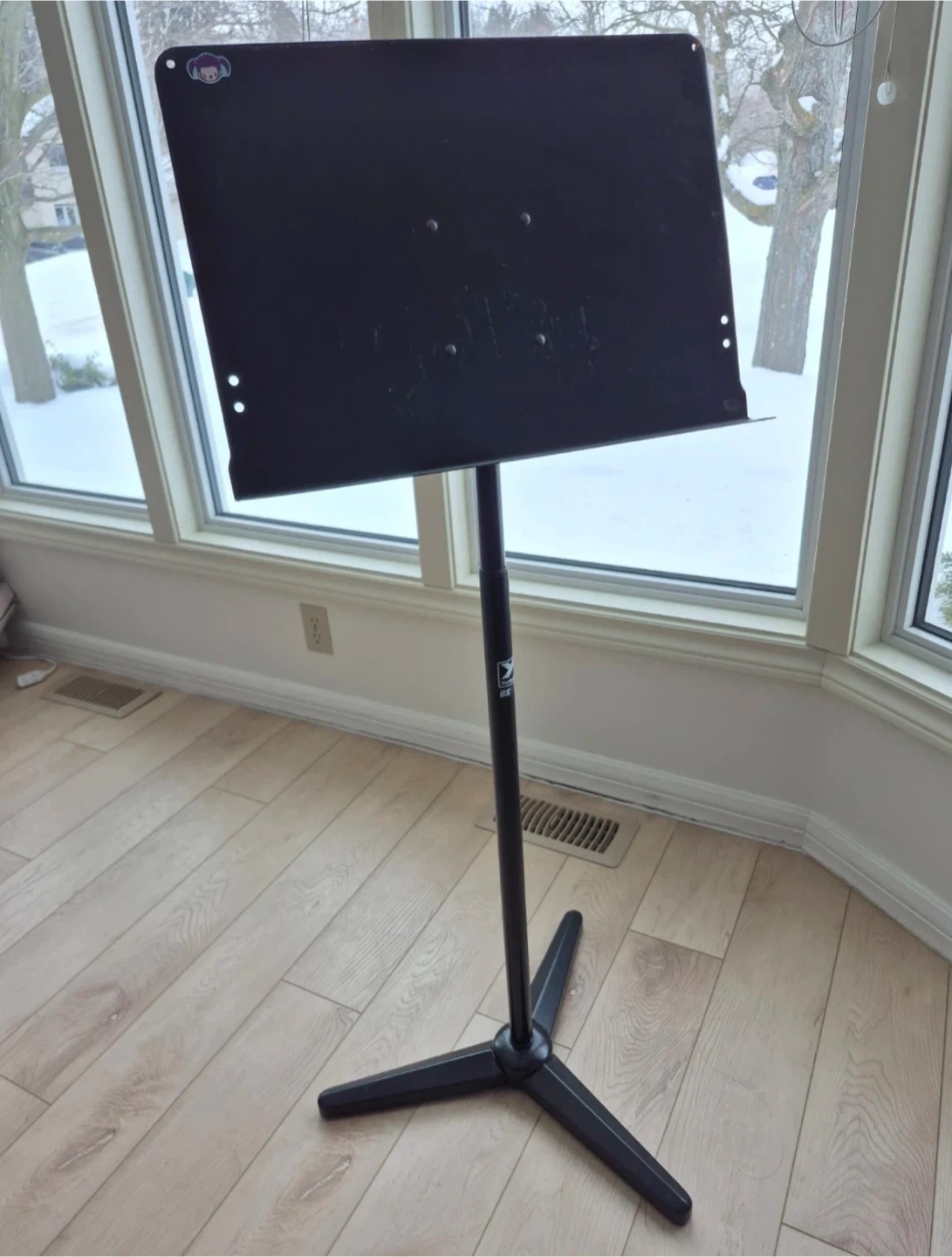 This is a black, adjustable music stand. It's made of metal and features a sturdy tripod base. It's perfect for holding sheet music while playing an instrument.