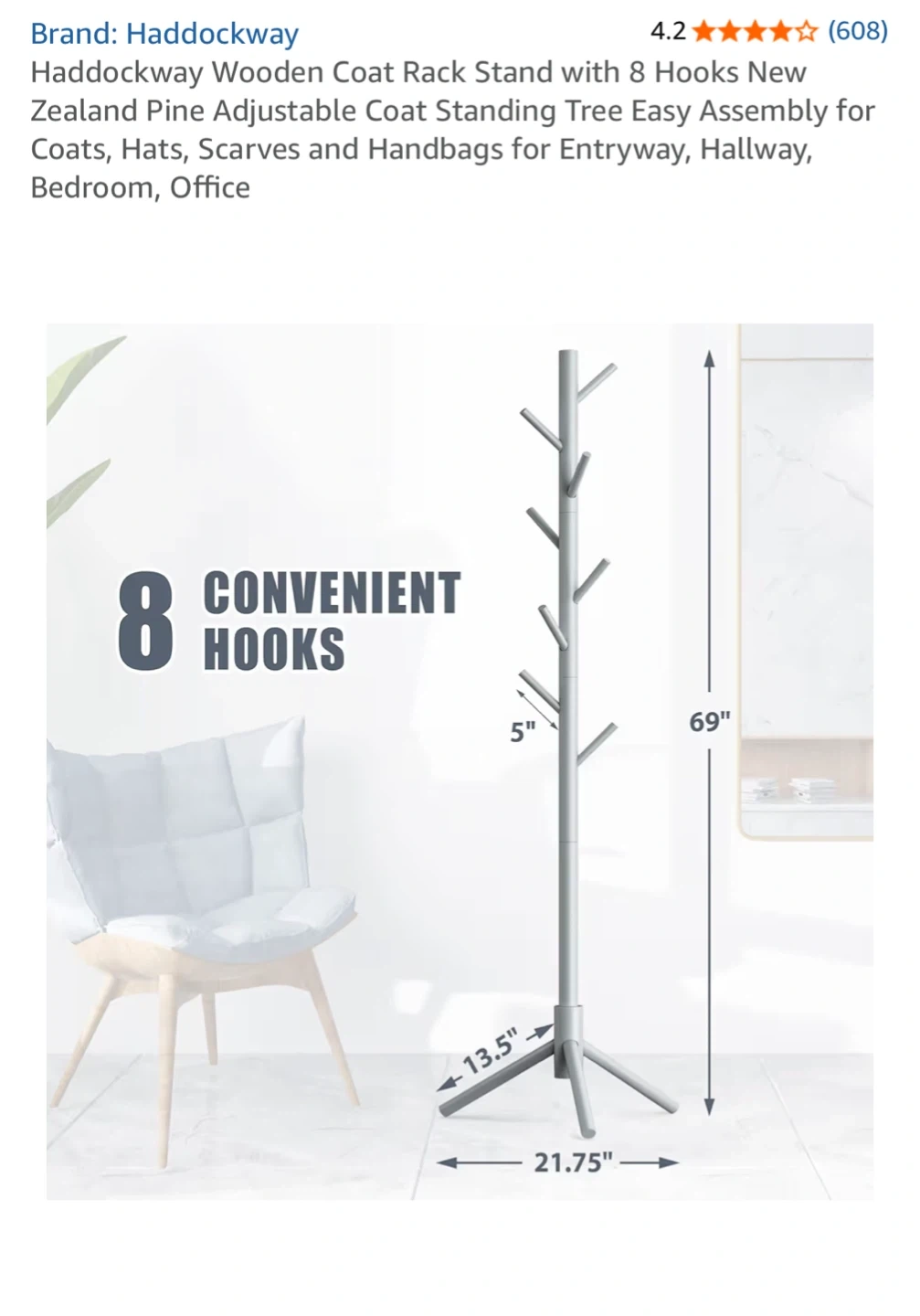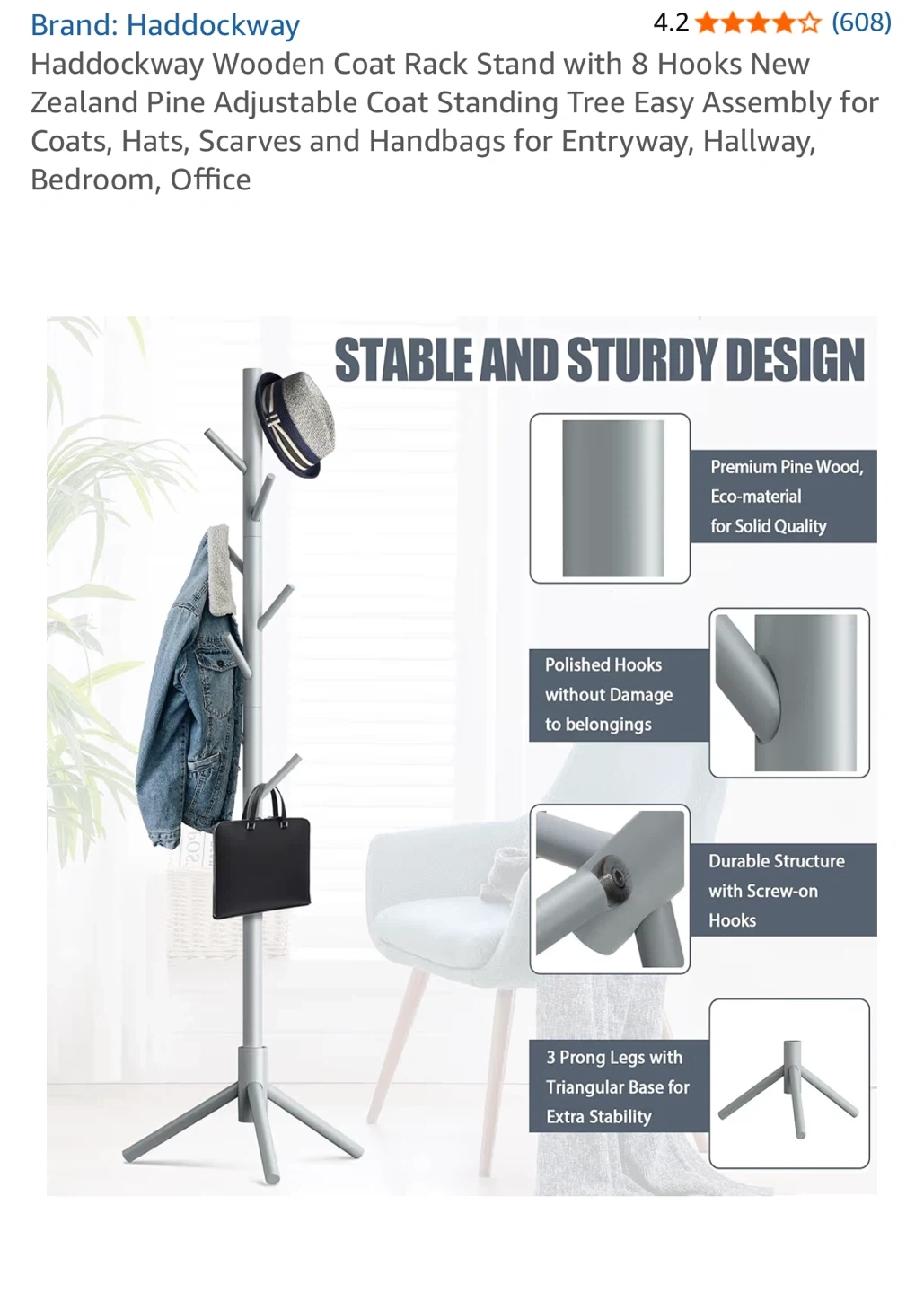 This Haddockway coat rack stand is made from premium pine wood. It features 8 convenient hooks and a stable triangular base. The overall height is 69 inches.