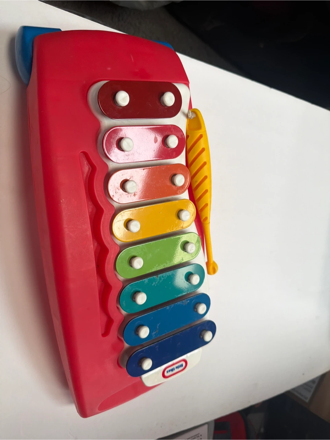 This is a Little Tikes toy xylophone. It has 8 colorful metal bars that produce different notes. The toy includes a yellow mallet for playing. It's made of durable plastic and metal.