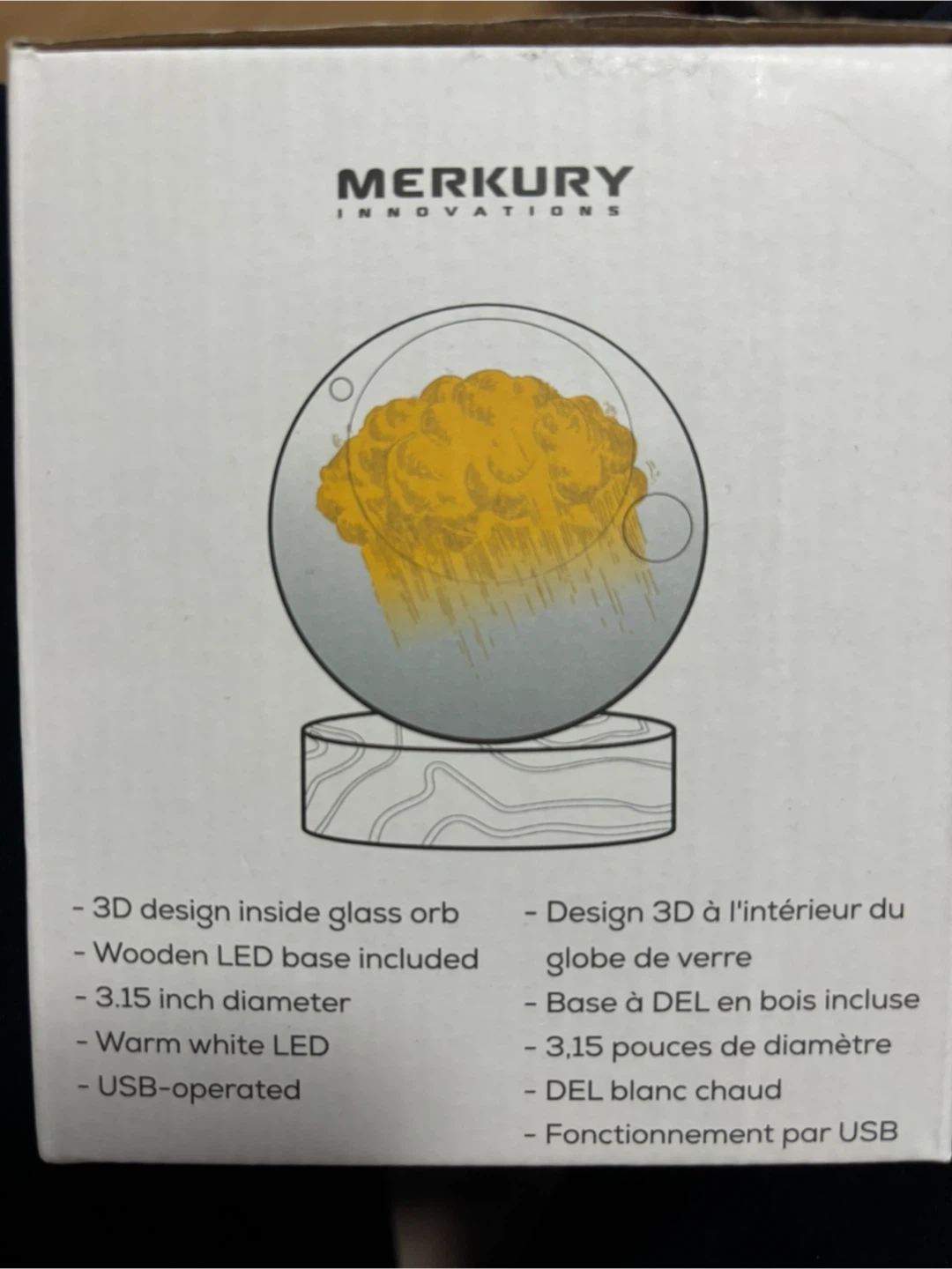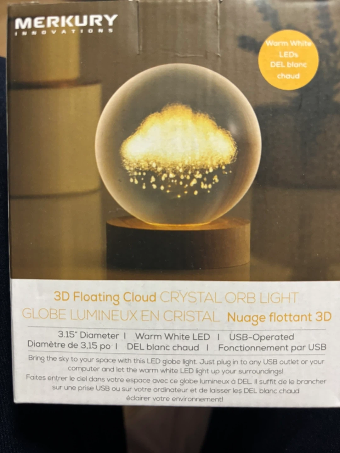 Merkury Innovations 3D Floating Cloud Crystal Orb Light with a wooden LED base. It's USB-operated and provides warm white LED light. Diameter is 3.15 inches.