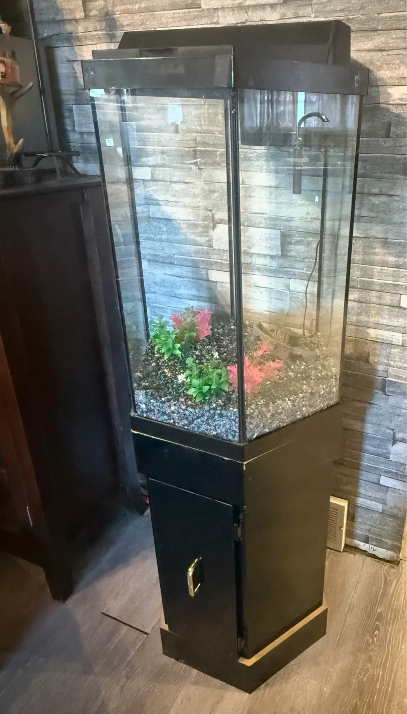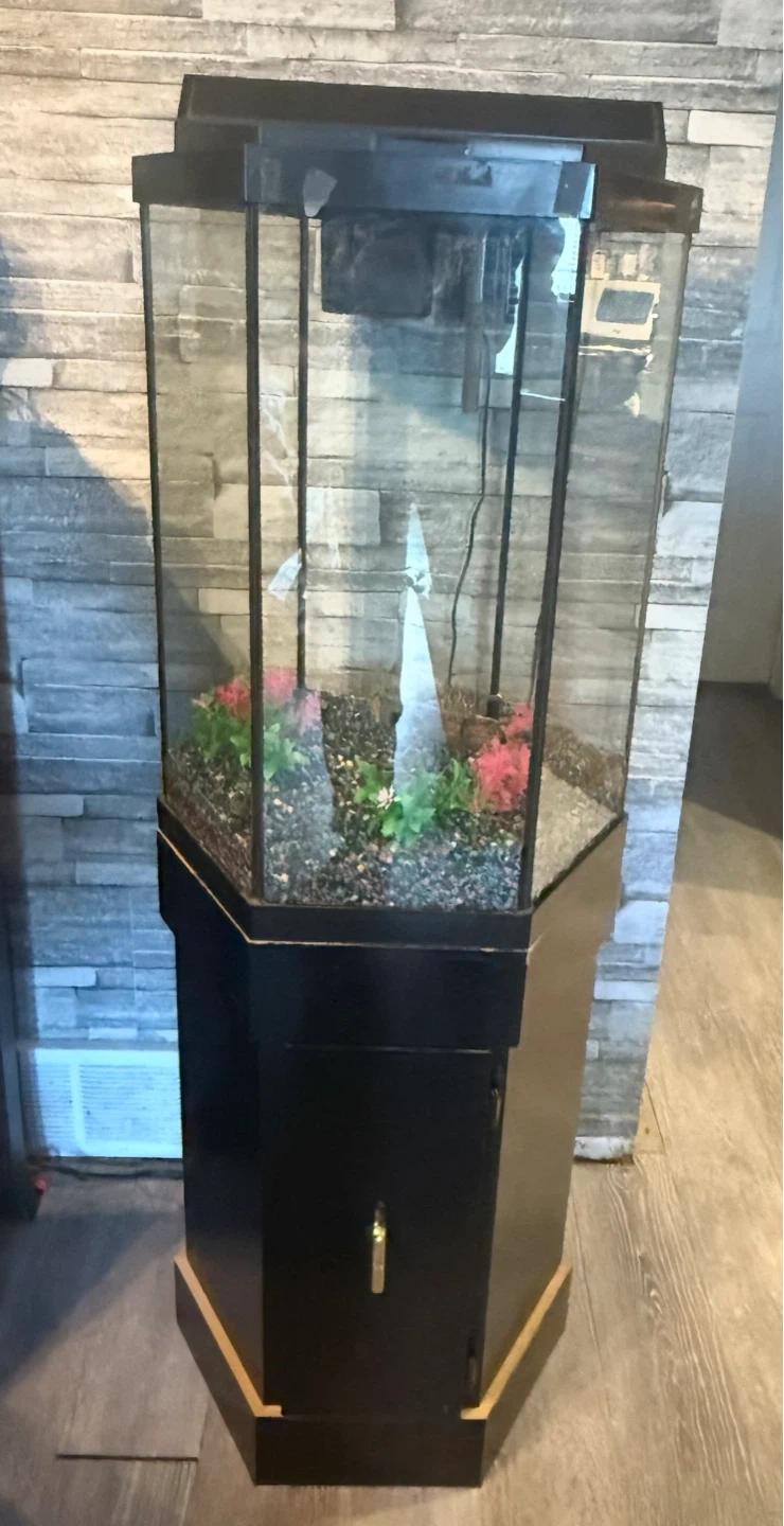 Tall hexagonal glass aquarium with a black stand. It includes gravel and artificial plants. This tank is ready for your aquatic pets!