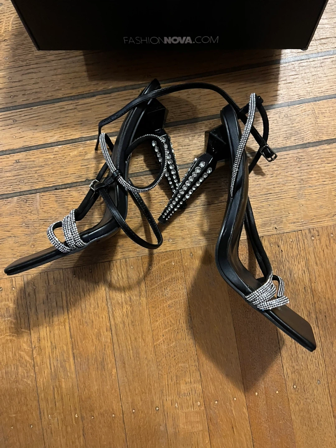 Selling a pair of Fashion Nova black heels in size 8. They have a stylish design with rhinestone detailing. The box is included!