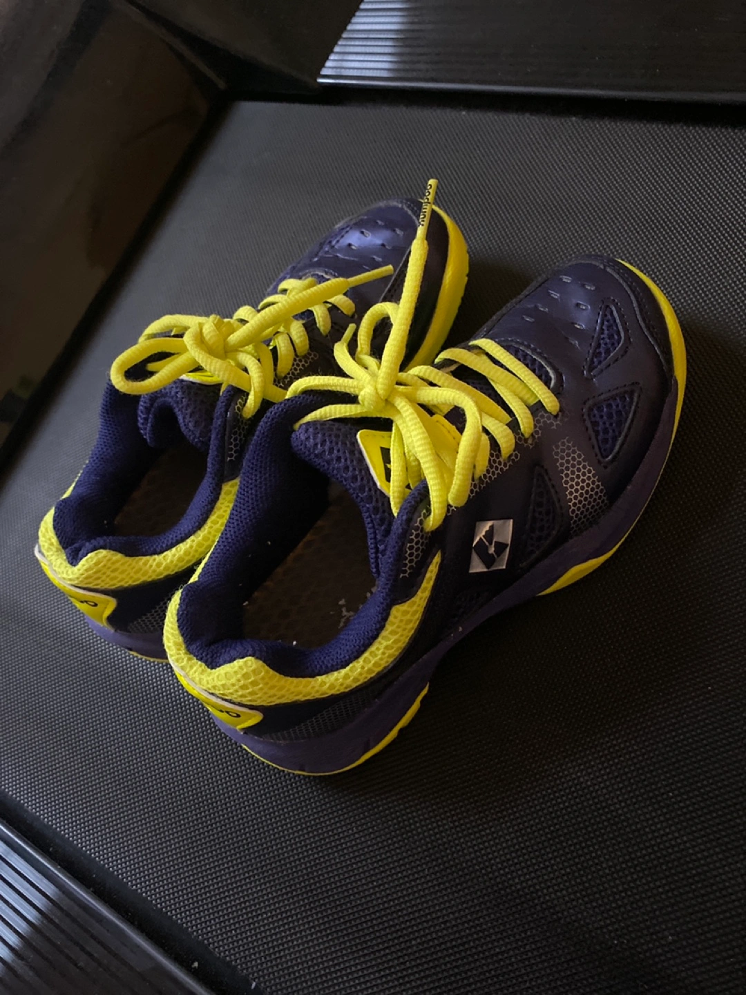 Pair of used Kumpoo brand indoor court shoes. Purple and neon yellow. Good condition. USA size is 4.5 and Europe size is 35.