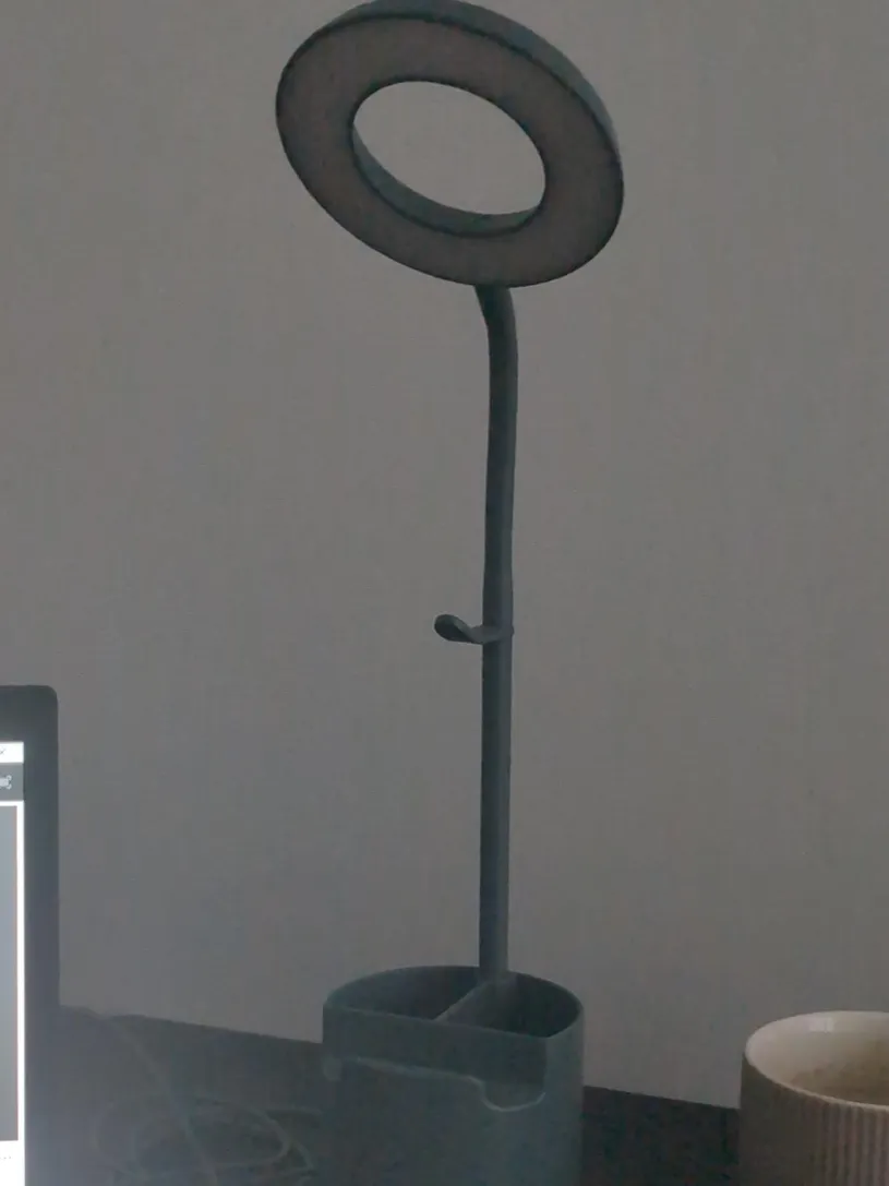 This is a desk ring light with an adjustable gooseneck and a built-in holder. It's great for video calls or creating content. The base also has compartments for small items.