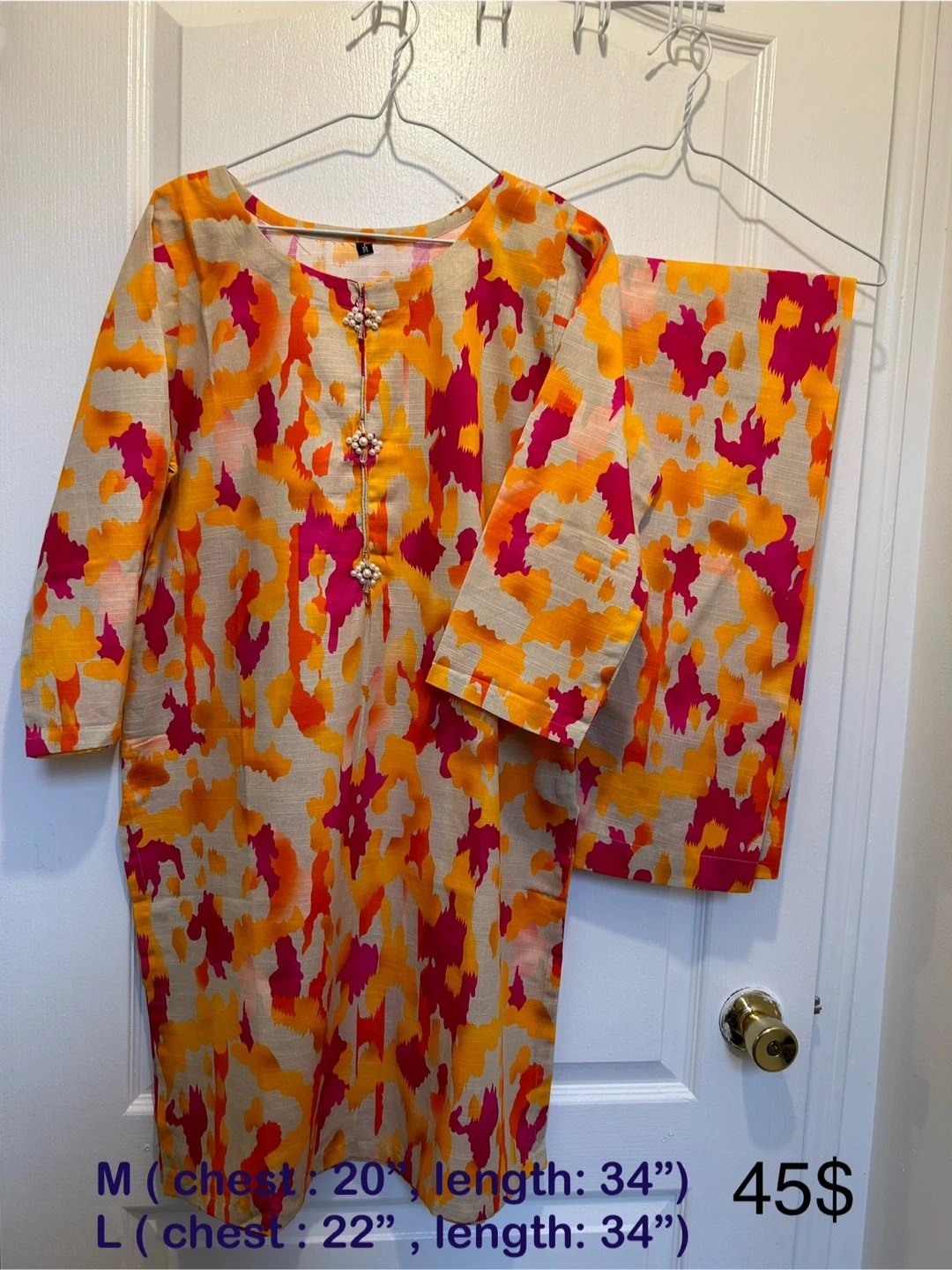 The chest measures 20" and the length is 34". It features a unique pattern with orange and pink hues, perfect for adding a pop of colour to your wardrobe