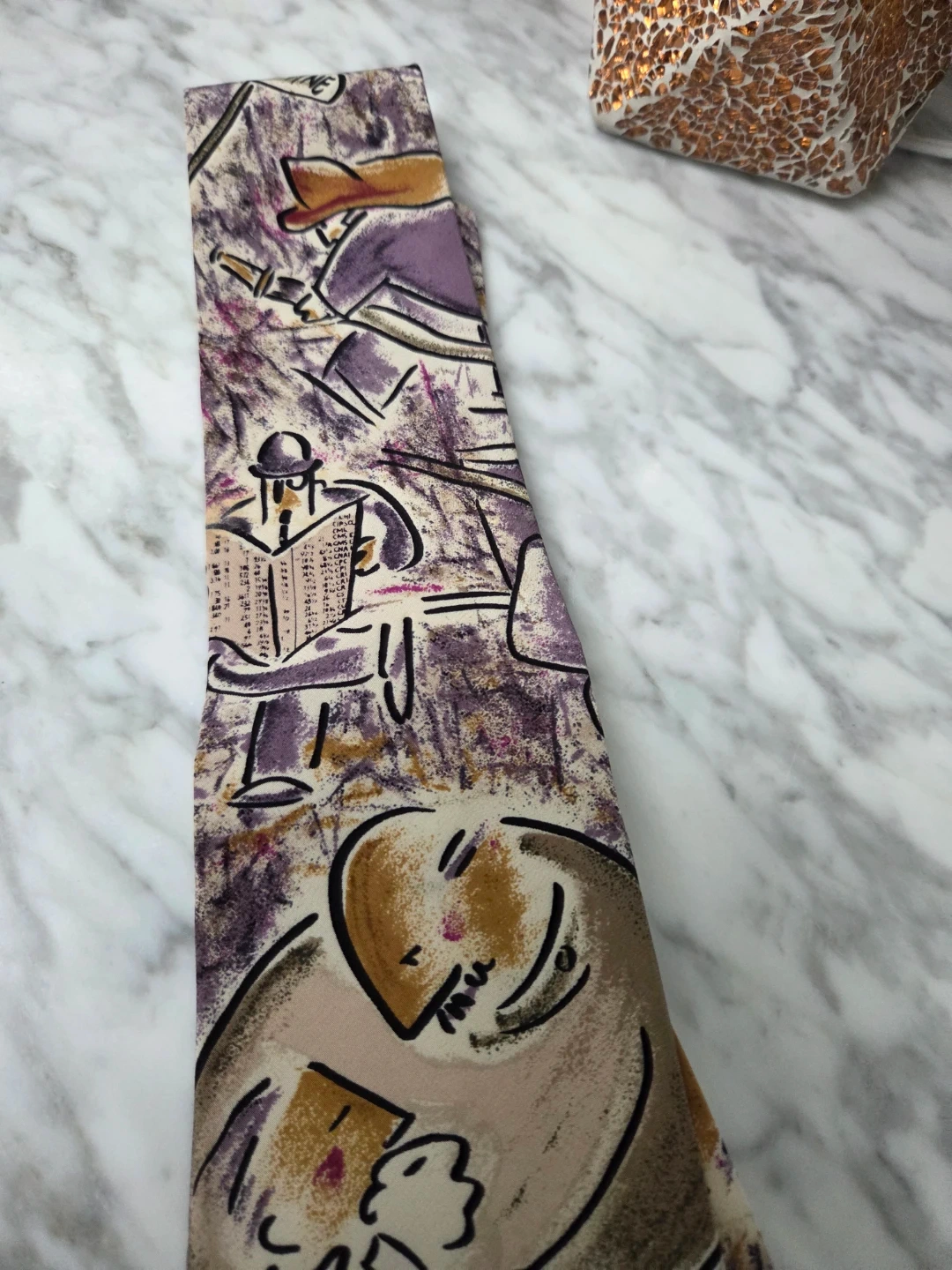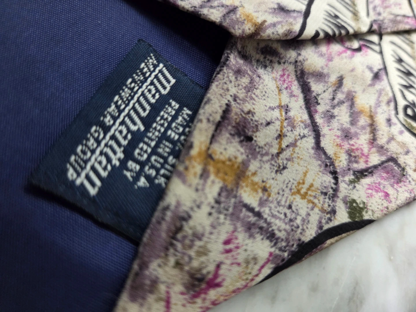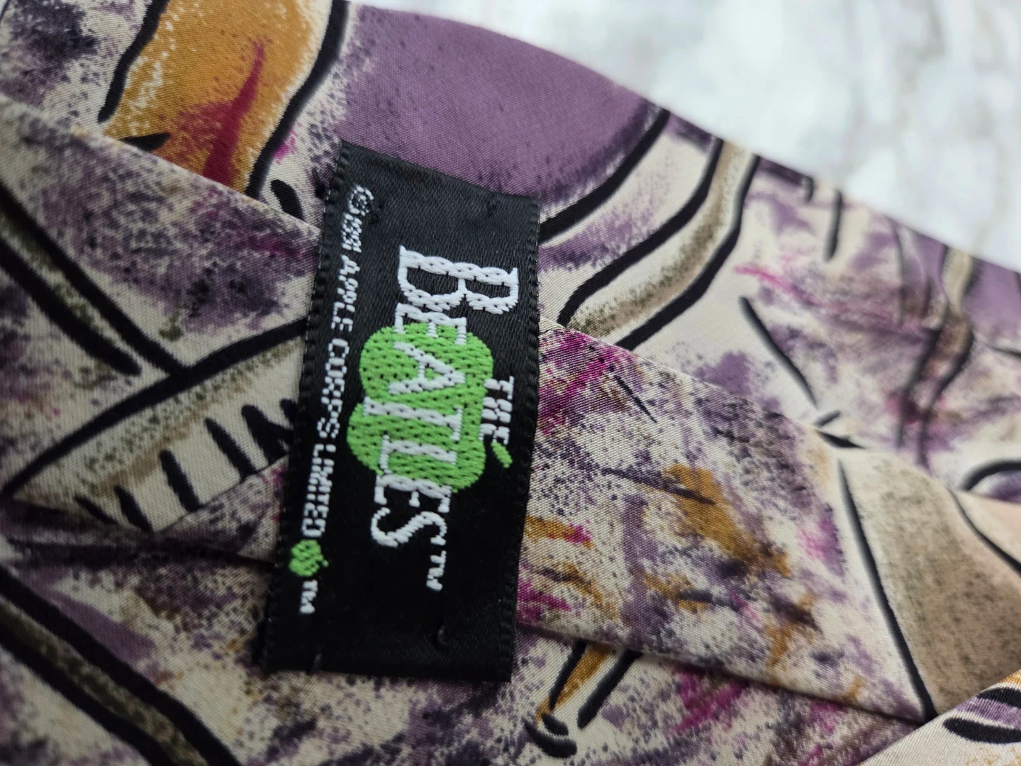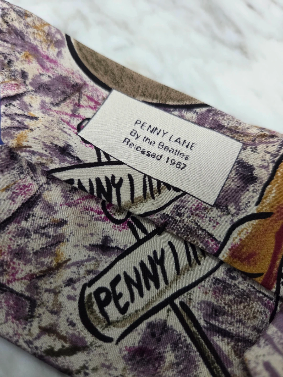 A vintage silk tie from Manhattan, featuring The Beatles' "Penny Lane" design released in 1967. Made in the USA.