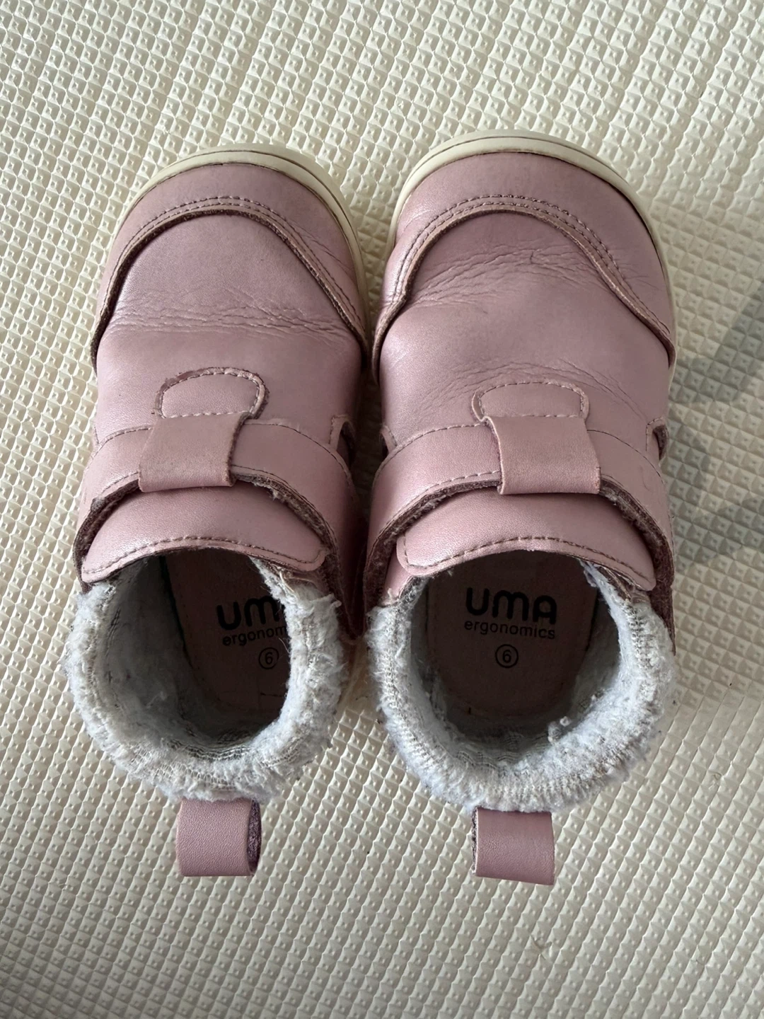 UMA Ergonomics pink leather boots with a cozy fleece lining. Size 6. Easy hook-and-loop closure. These boots are great for keeping little feet warm!