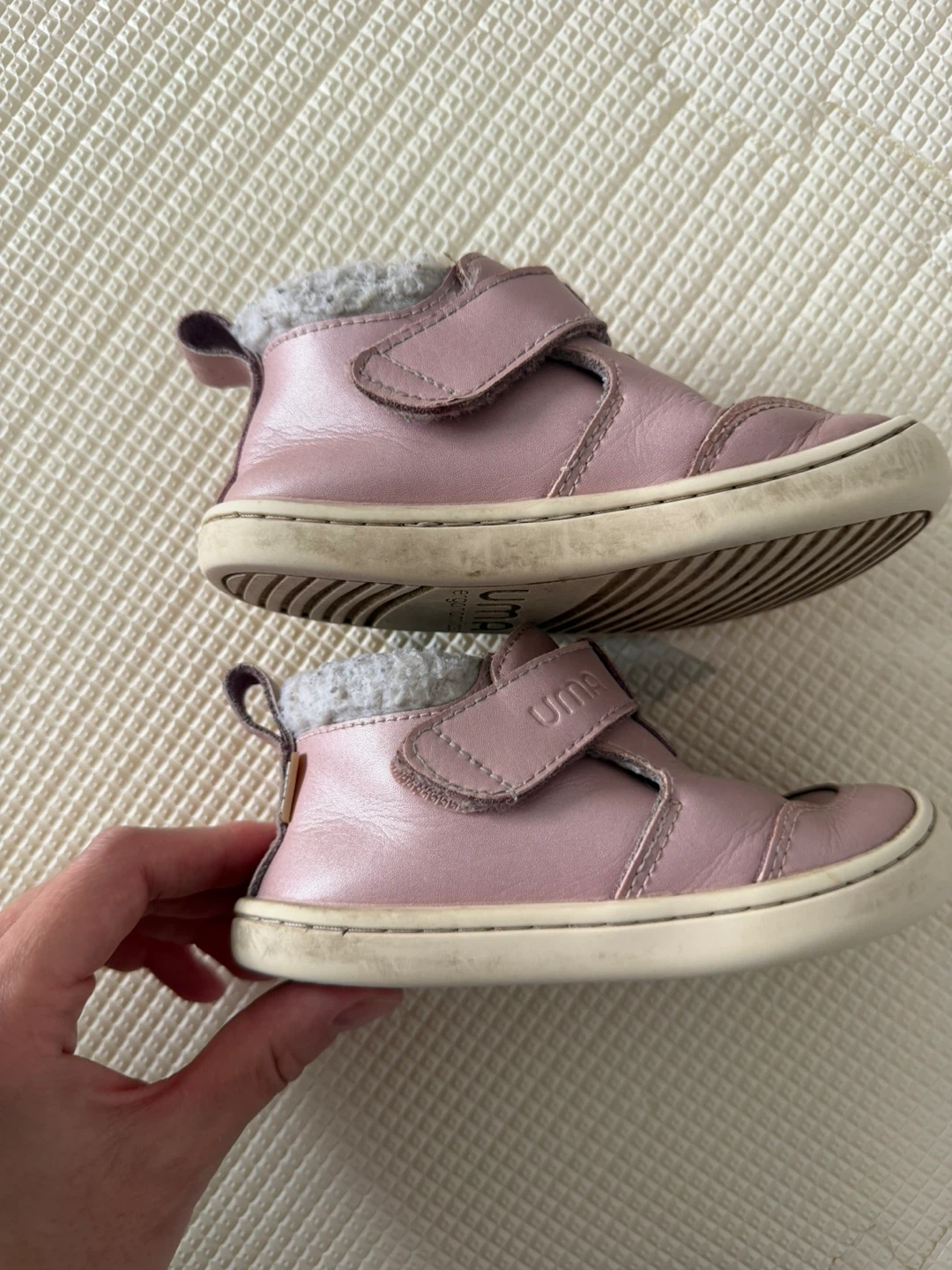 UMA Ergonomics pink leather boots with a cozy fleece lining. Size 6. Easy hook-and-loop closure. These boots are great for keeping little feet warm!