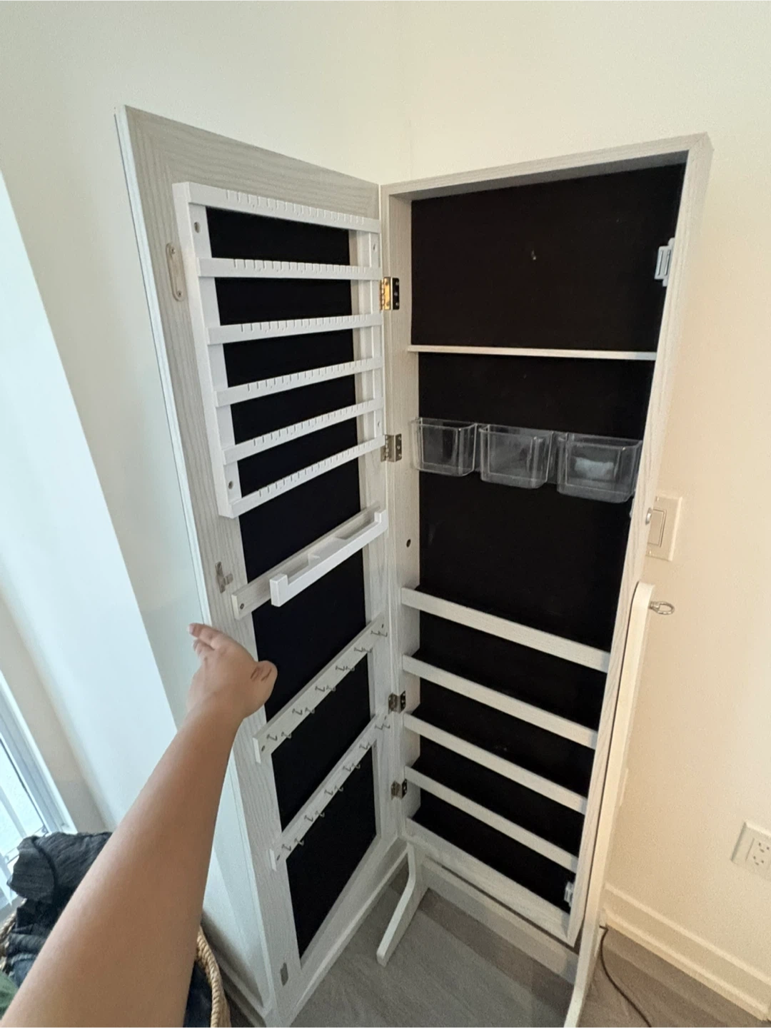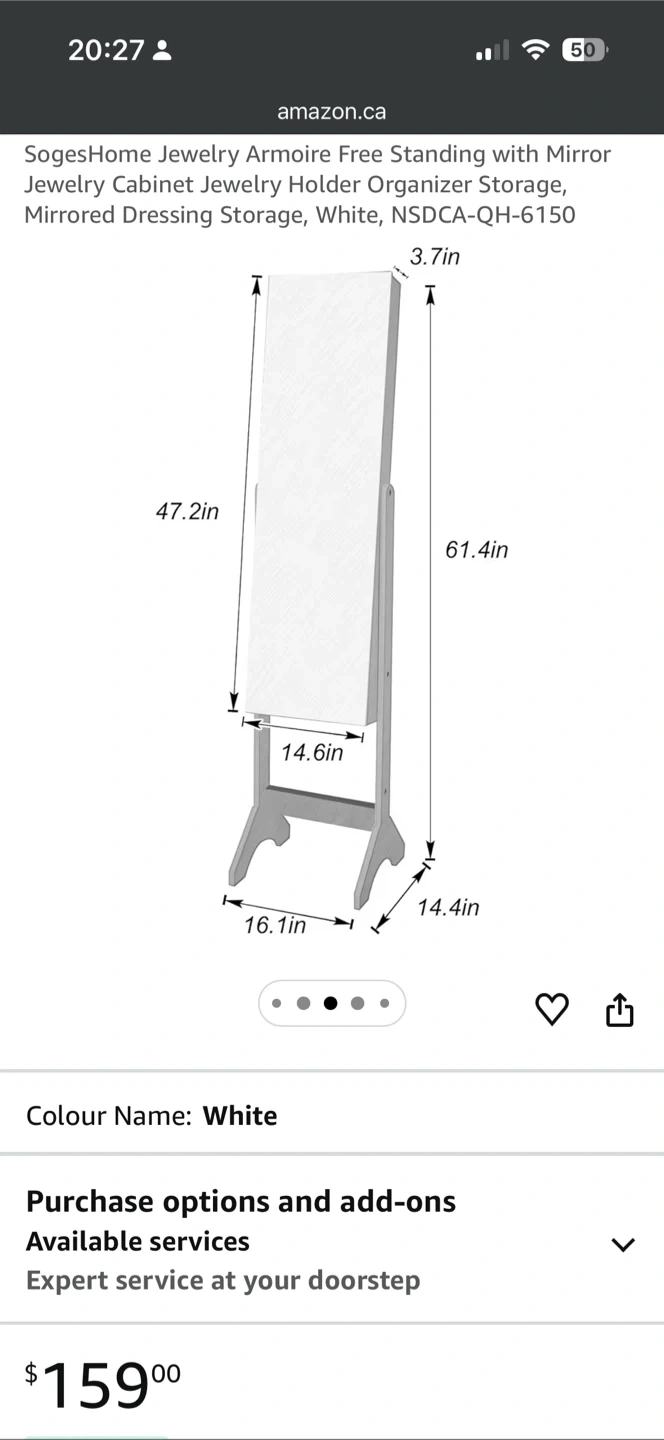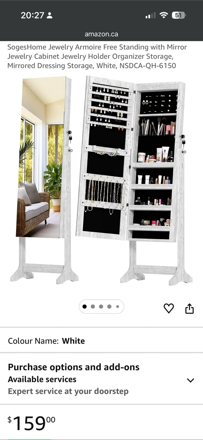 This white, free-standing jewelry armoire features a full-length mirror and internal storage for your accessories. It's built with a sturdy wooden frame and includes various organizers for necklaces, earrings, rings, and more. Keep your jewellery neat and accessible!