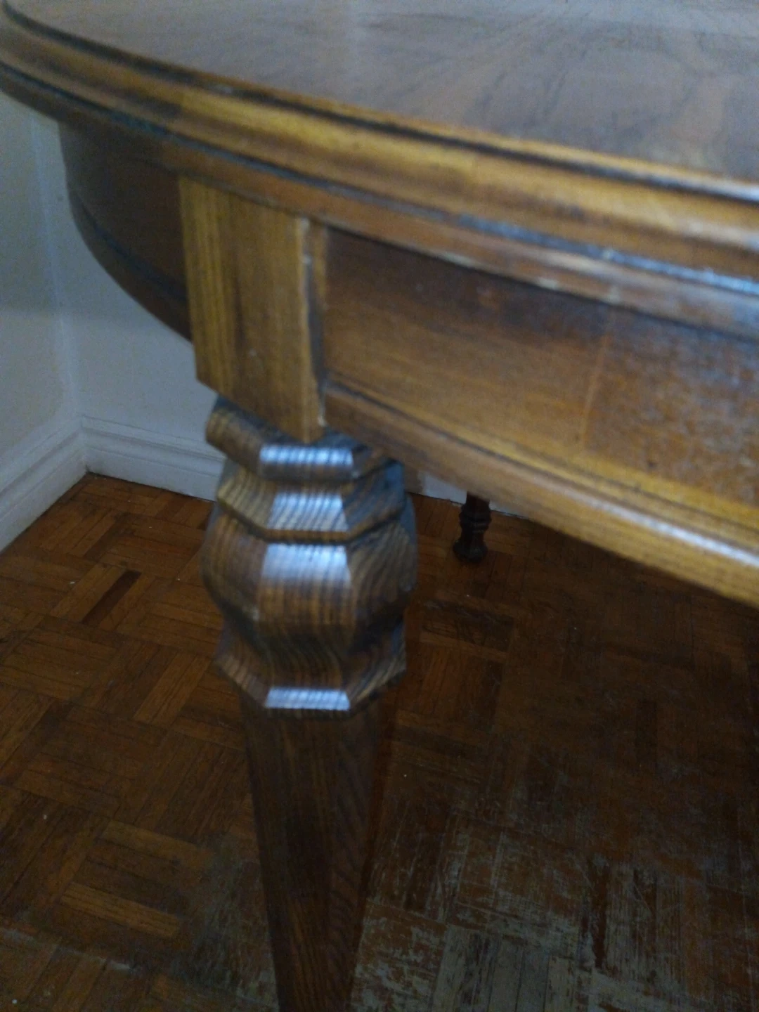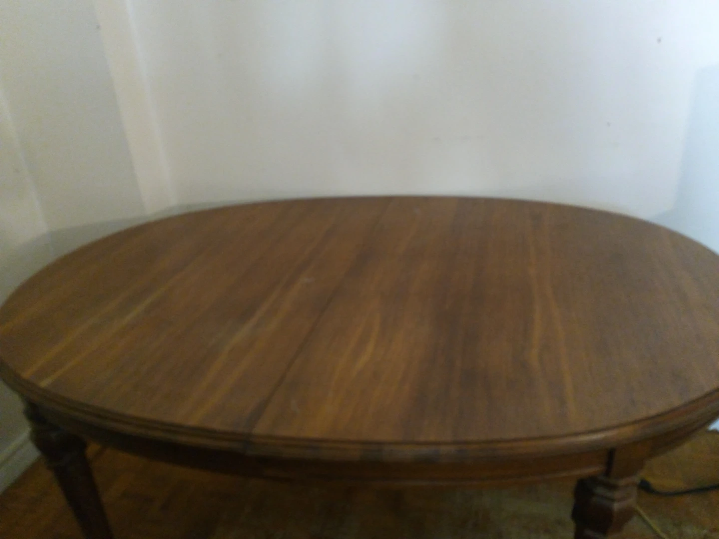This is a solid wooden oval table with decorative turned legs. It's made of dark stained wood. It's a sturdy piece of furniture.