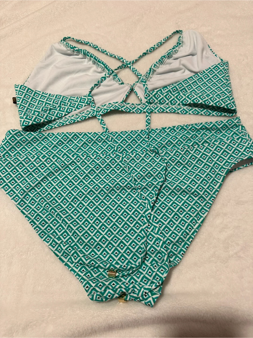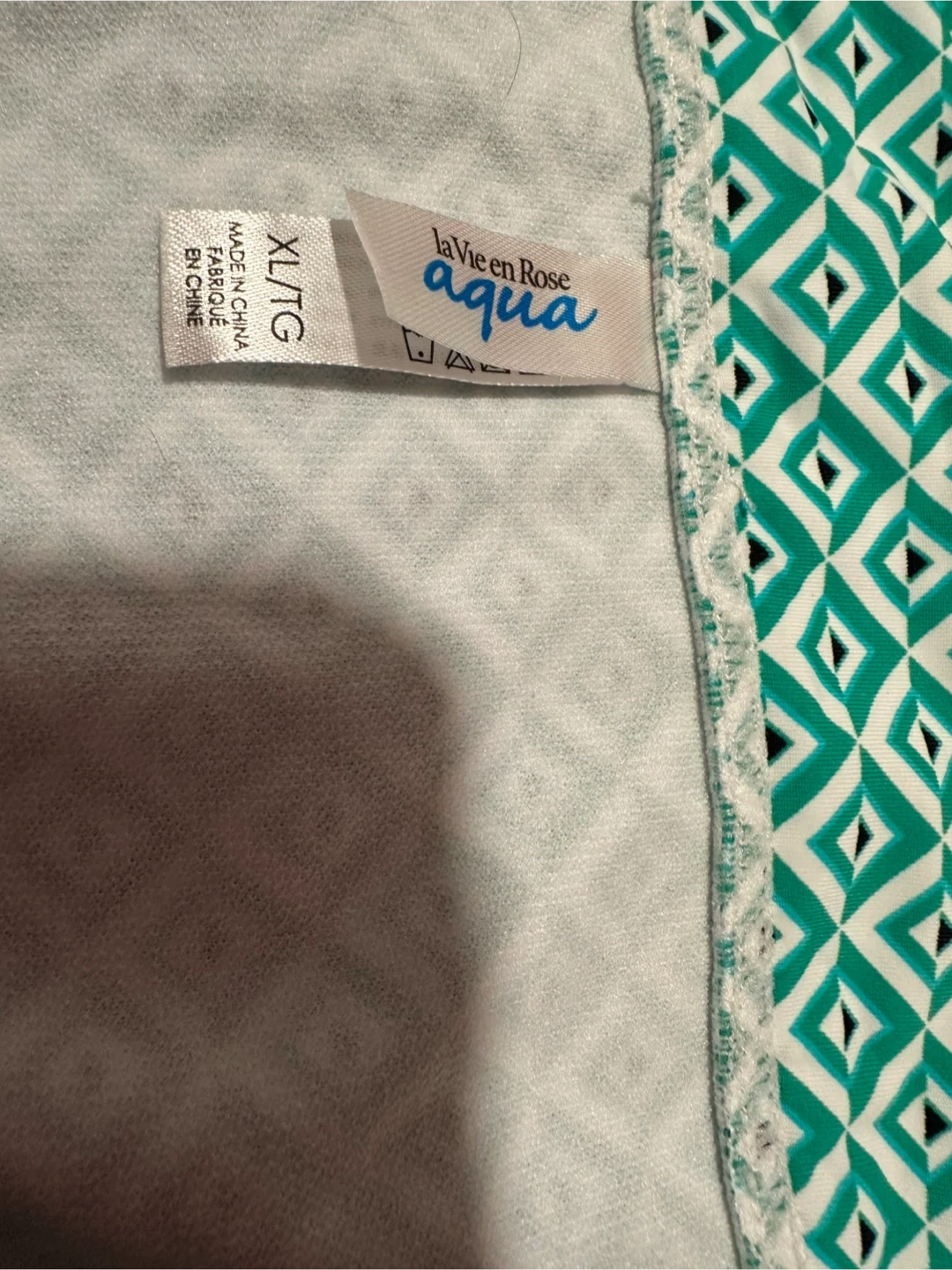 This La Vie en Rose Aqua bikini set features a vibrant geometric print in green and white. It's a size XL/TG. The bikini has a criss-cross back detail on the top and a comfortable fit on the bottoms.